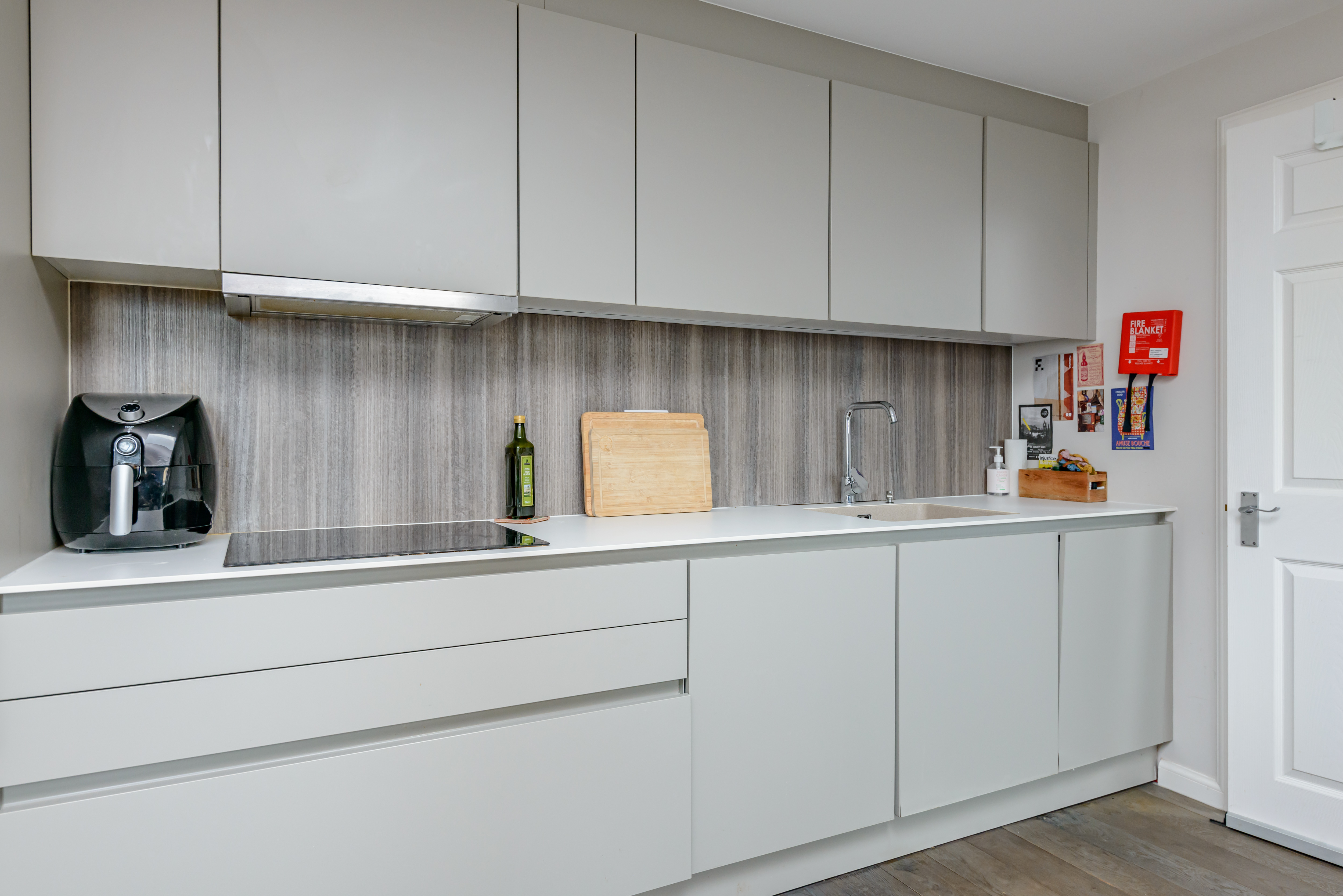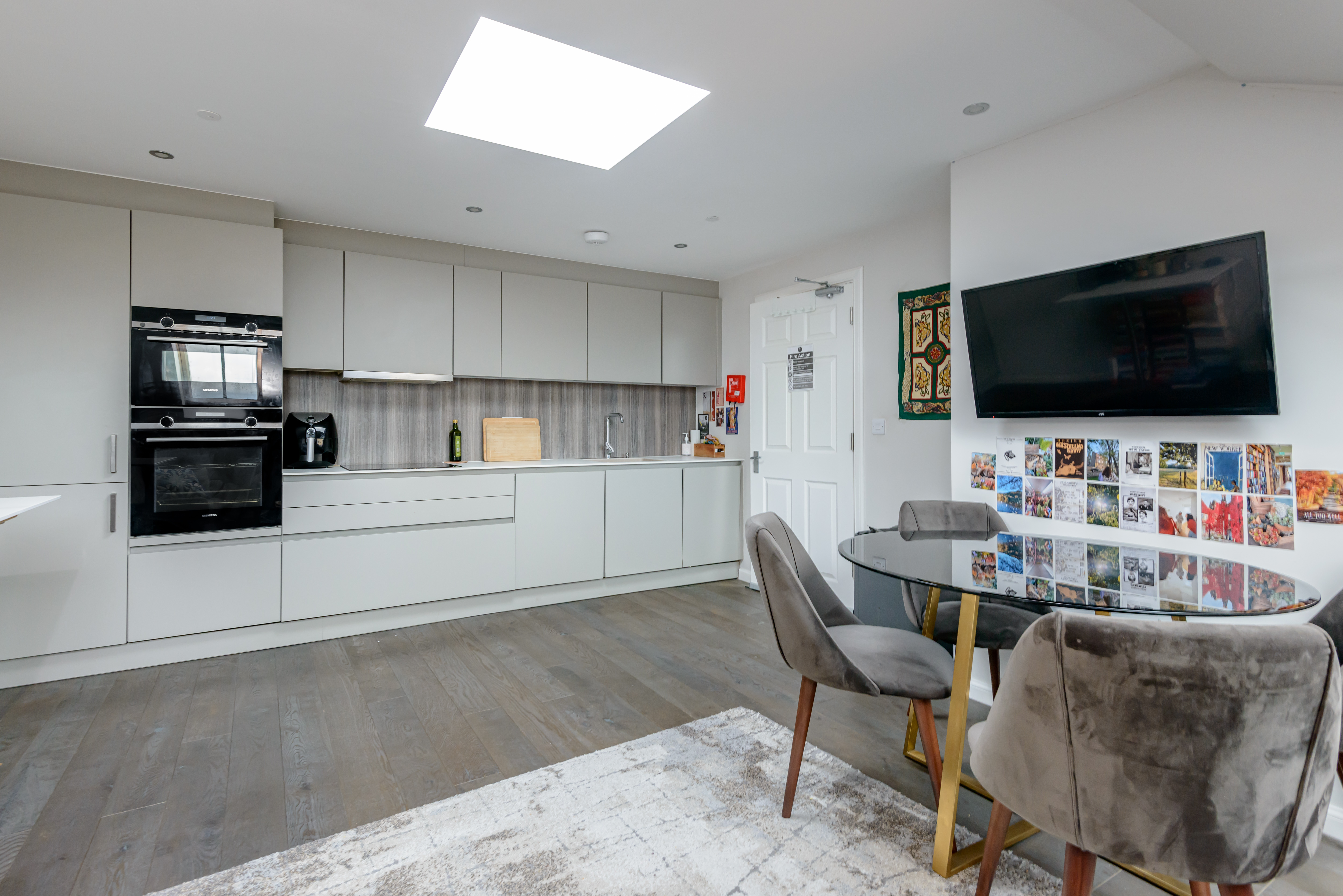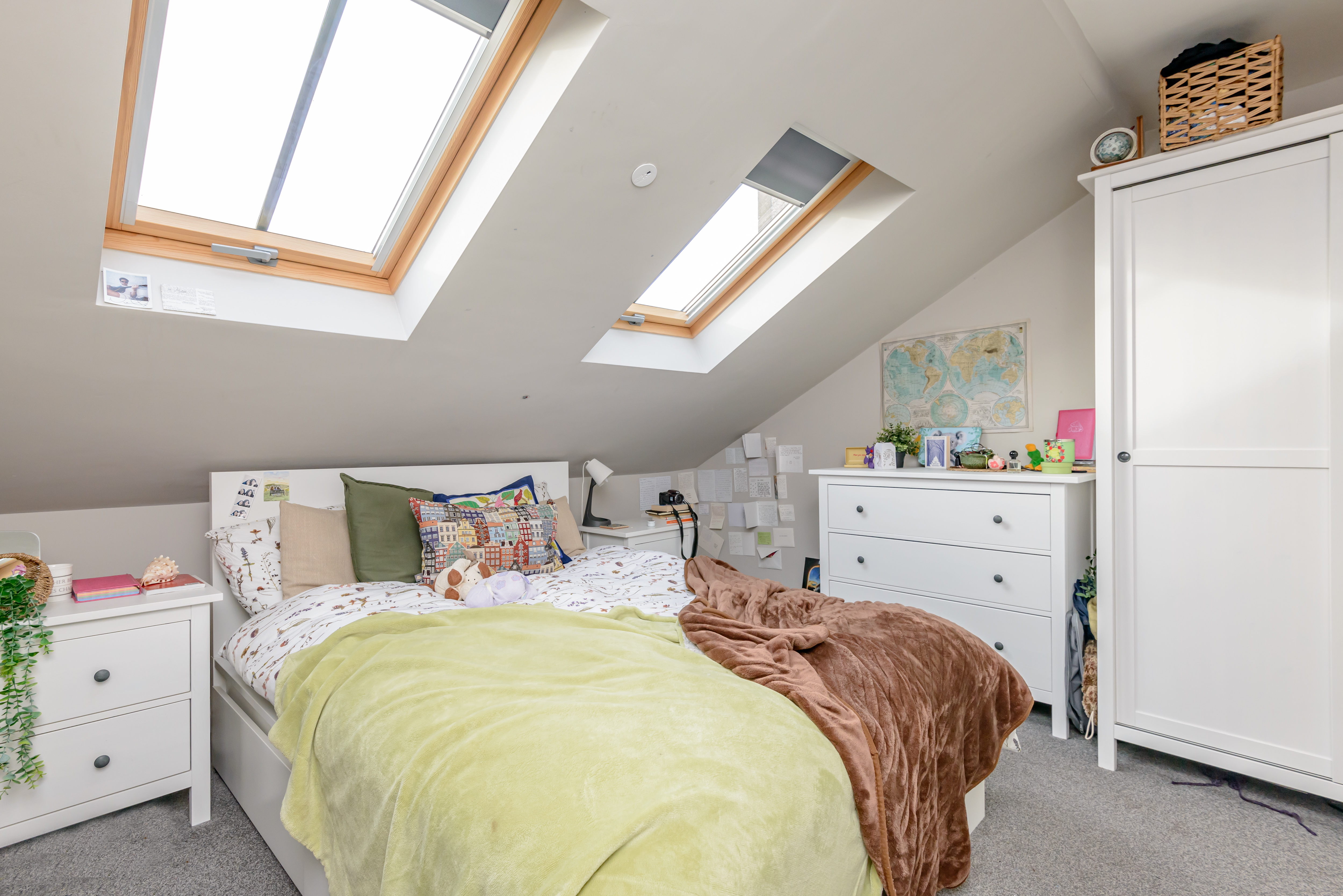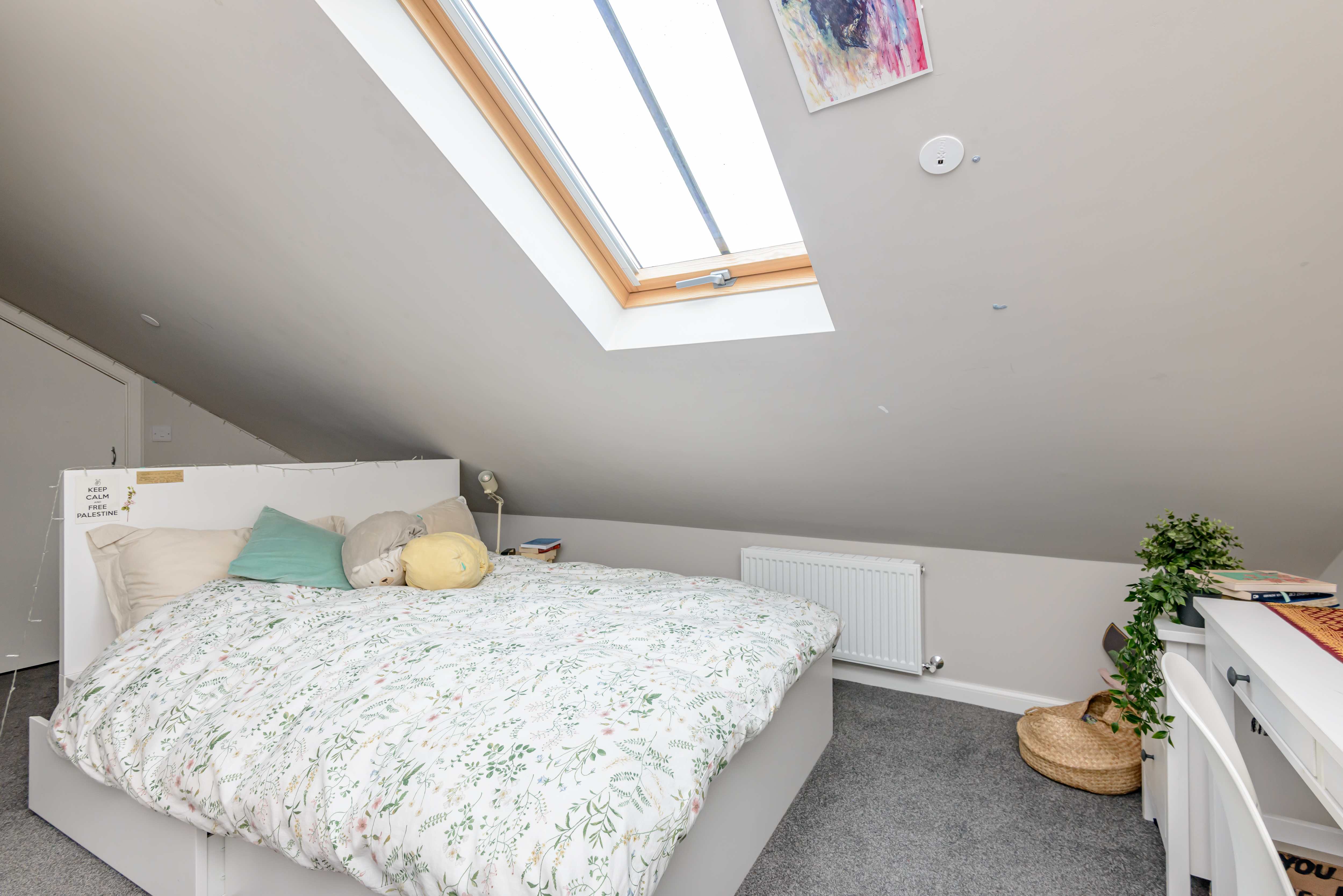 The flat is accessed from the third floor, with the front door opening onto an entrance area and a set of stairs leading up to the main body of the flat. The open plan sitting room / dining room / kitchen is filled with natural light from the two Velux windows and an overhead skylight and is a lovely space for all inhabitants to congregate. A sleek, stylish Kitchens International kitchen flanks the rear wall with gorgeous wall and base mounted cabinetry. The integrated appliances include an eye-level oven and microwave, hob, extractor hood, washing machine, dishwasher and fridge/freezer.