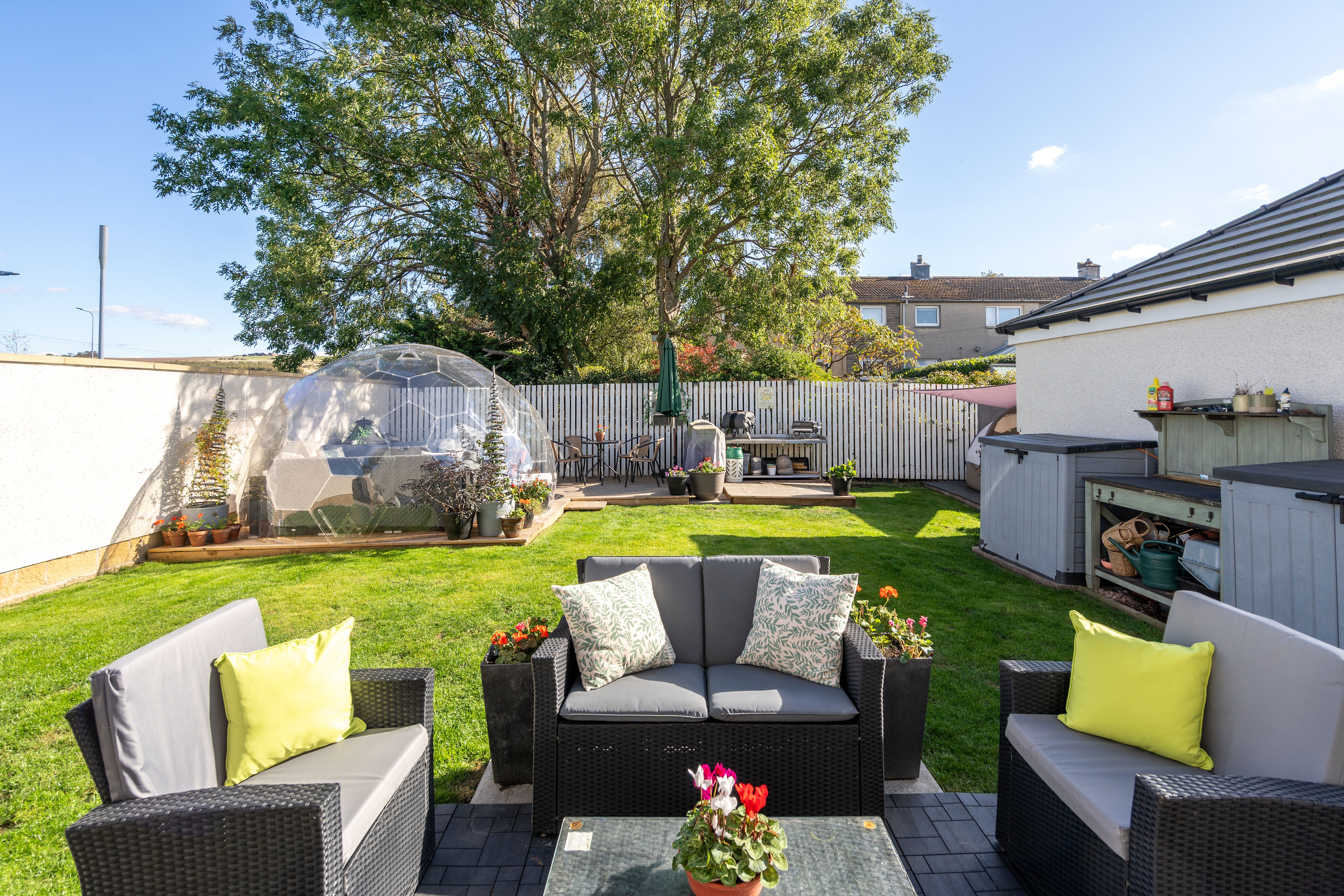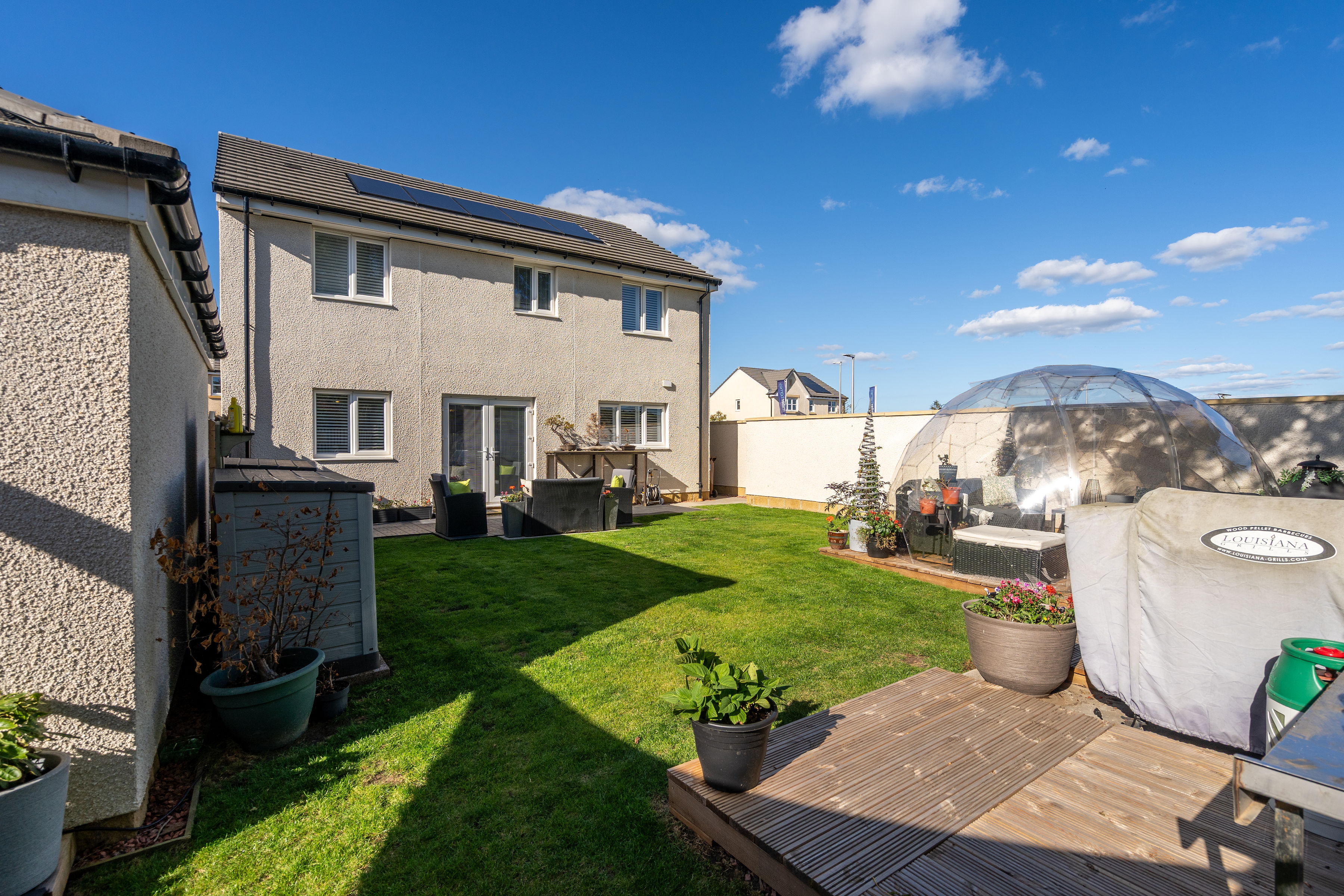 All blinds, light fittings, fitted flooring, and integrated appliances are included in the sale price. Note all three televisions and dome in the garden are not included in the sale. The storage units in the walk-in wardrobe are available by separate negotiation.