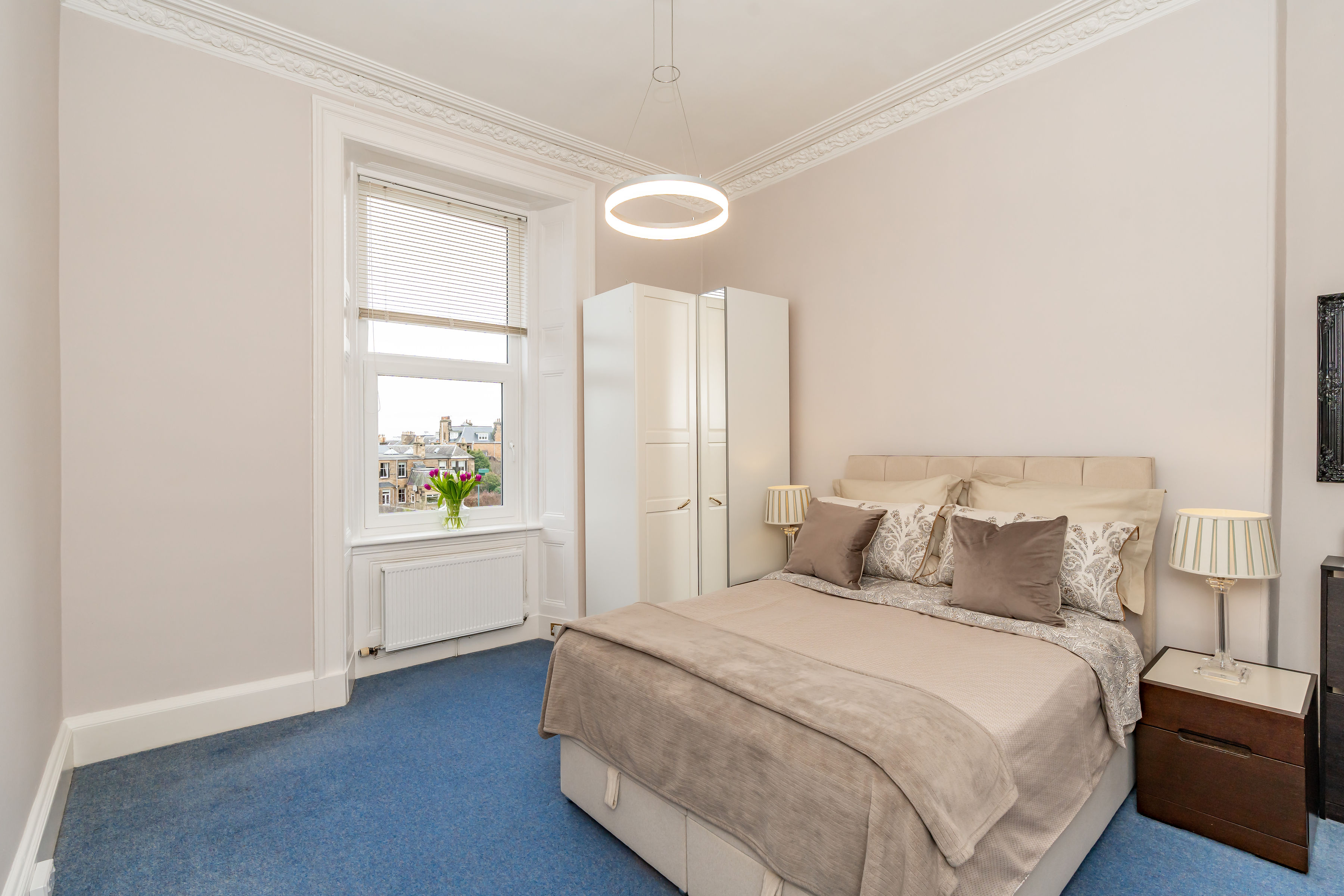 The property is accessed via a secure communal stair and opens into a welcoming hallway with a built-in storage cupboard. The spacious sitting room enjoys a bright south easterly aspect, featuring an attractive bay window, high ceilings, and elegant period detailing. From the bay, there are distant views of Edinburgh Castle and the Scott Monument, adding to the charm of the space. A modern kitchen sits off the hall, fitted with shaker-style cabinetry and integrated appliances. Two generous double bedrooms to the rear, benefit from stunning views of Arthur's Seat and the principal bedroom also has a built-in wardrobe for convenience. A third bedroom is situated to the front of the home. A contemporary shower room, complete with walk-in shower, stylish tiling, wash hand basin with vanity, WC and chrome heated towel rail completes the accommodation.