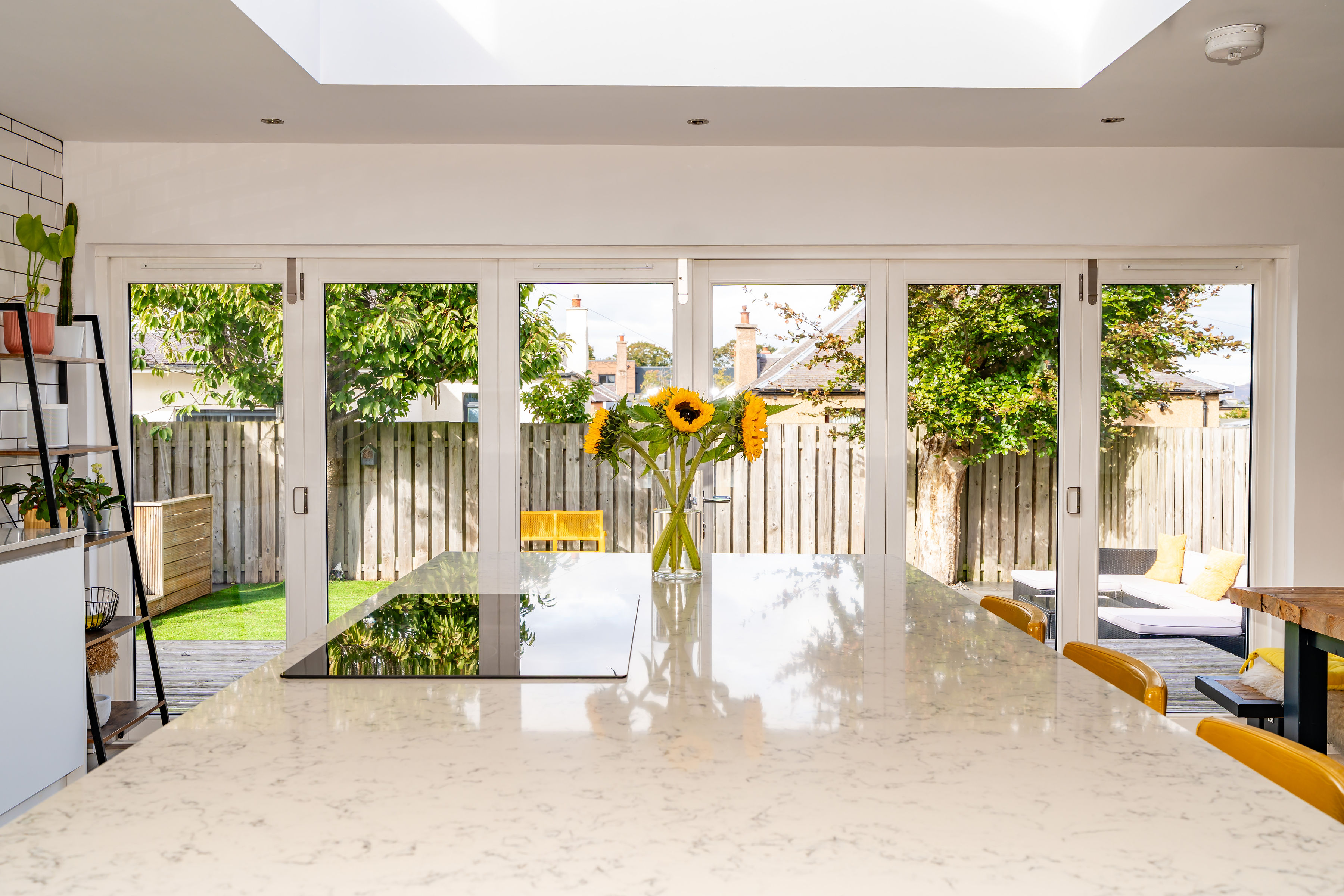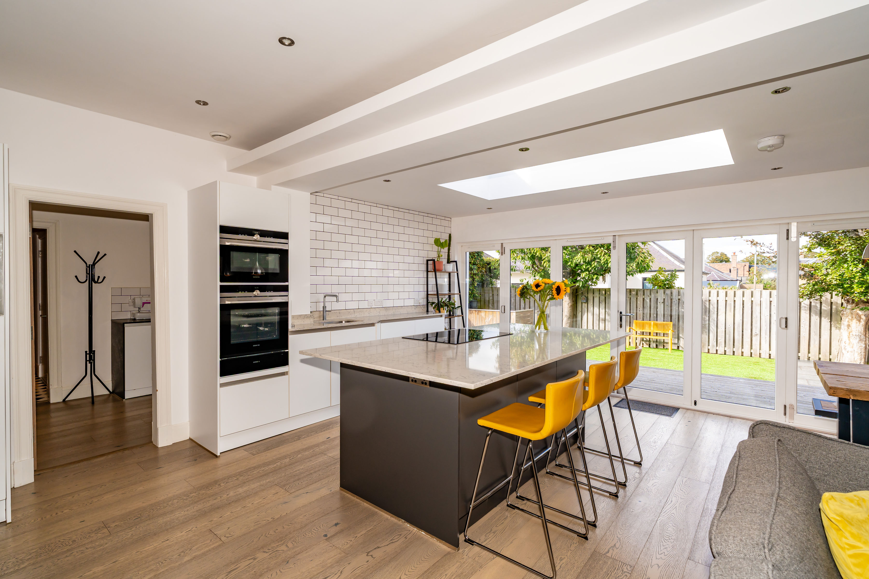 At the heart of the home is a stunning open-plan kitchen, dining, and living space — a bright, welcoming area designed for everyday living and entertaining alike. The contemporary kitchen features sleek cabinetry, high-spec integrated appliances, dining island and generous worktop space, while the adjoining living and dining areas offer a seamless flow to the rear garden, creating a true indoor-outdoor lifestyle.