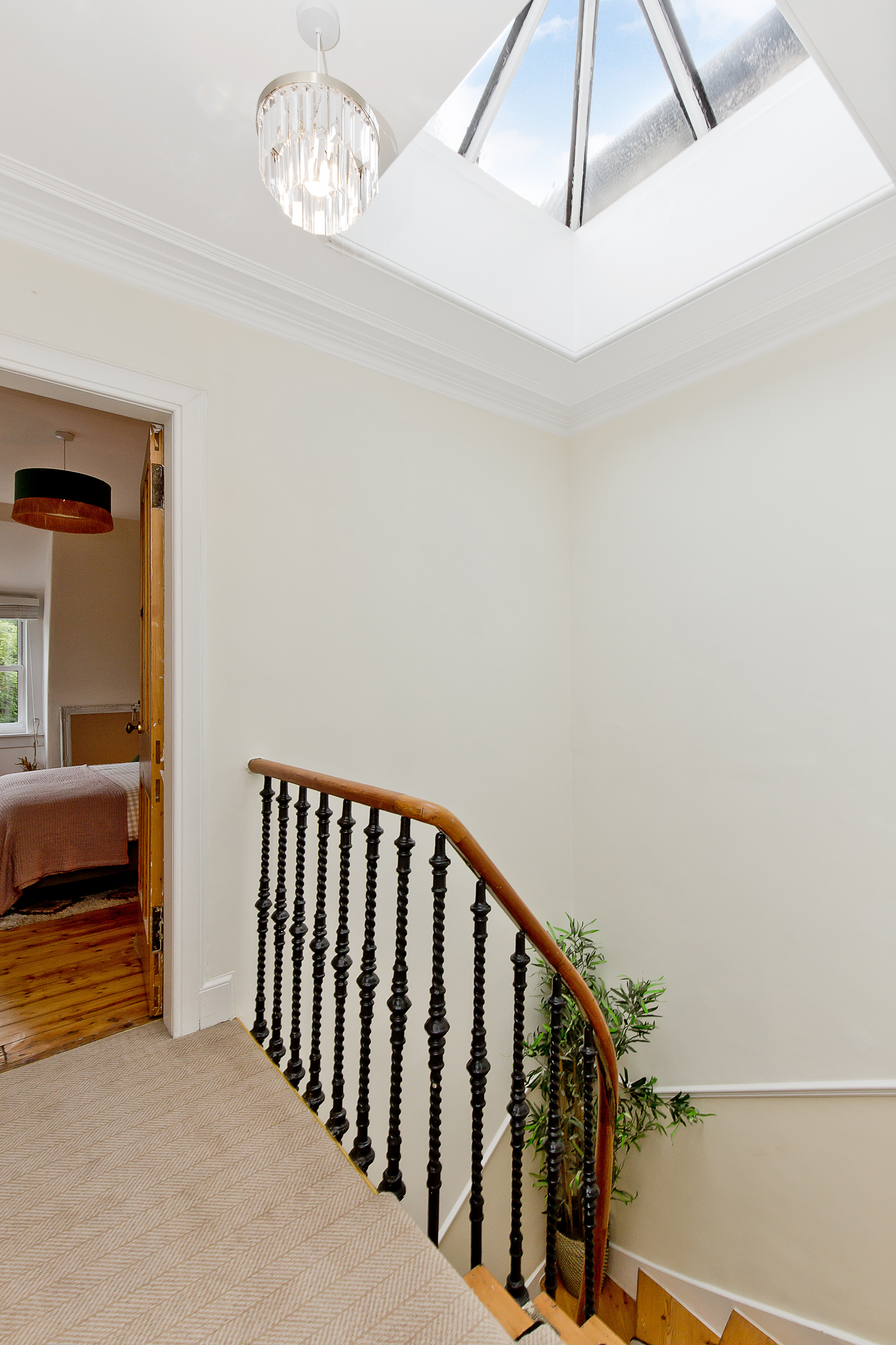 On the top floor, there are two further well-proportioned double bedrooms, both bright and airy, along with a contemporary family bathroom positioned between them. The upper landing is naturally illuminated by a central cupola, enhancing the sense of space and architectural interest throughout the home.