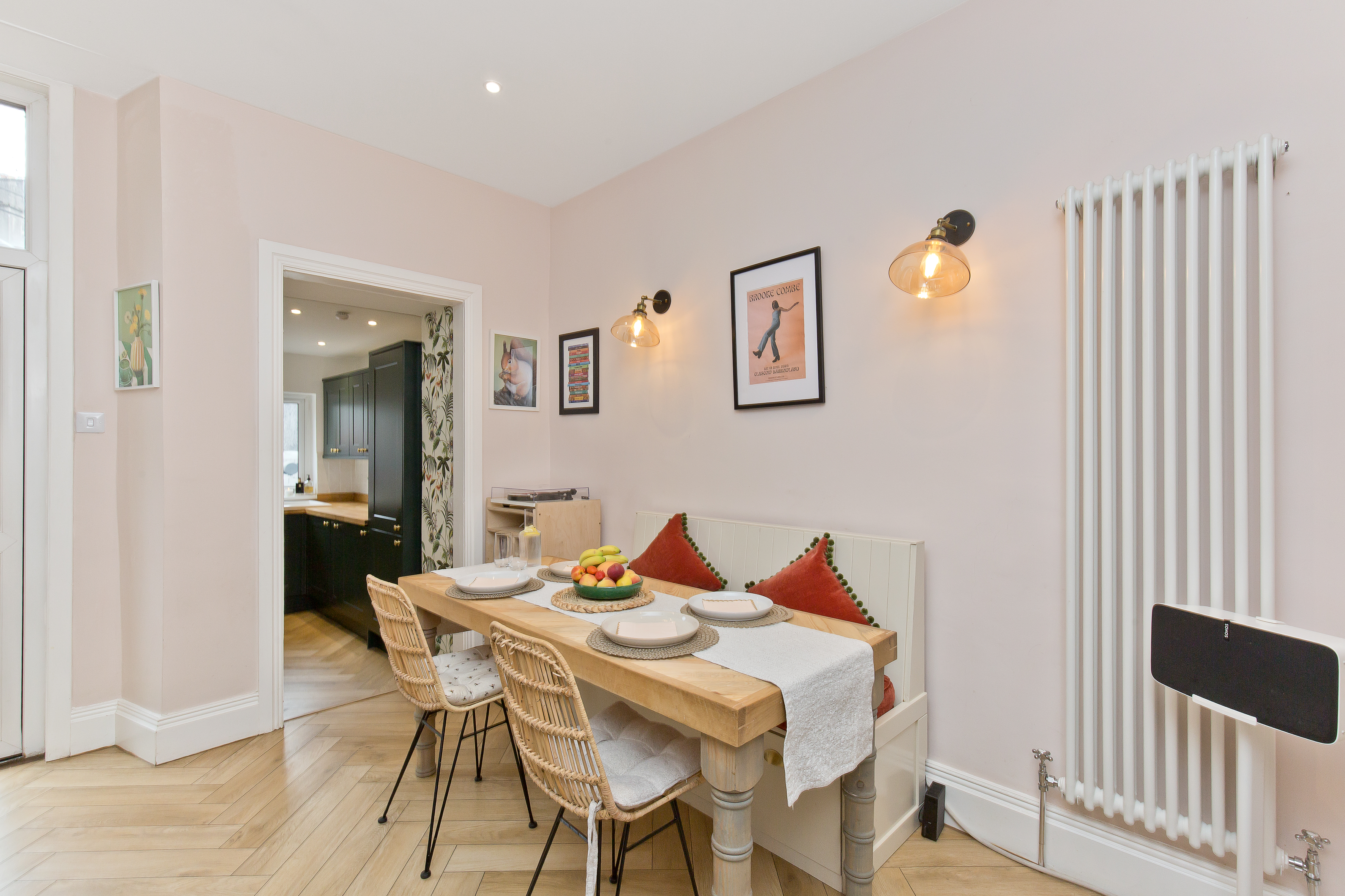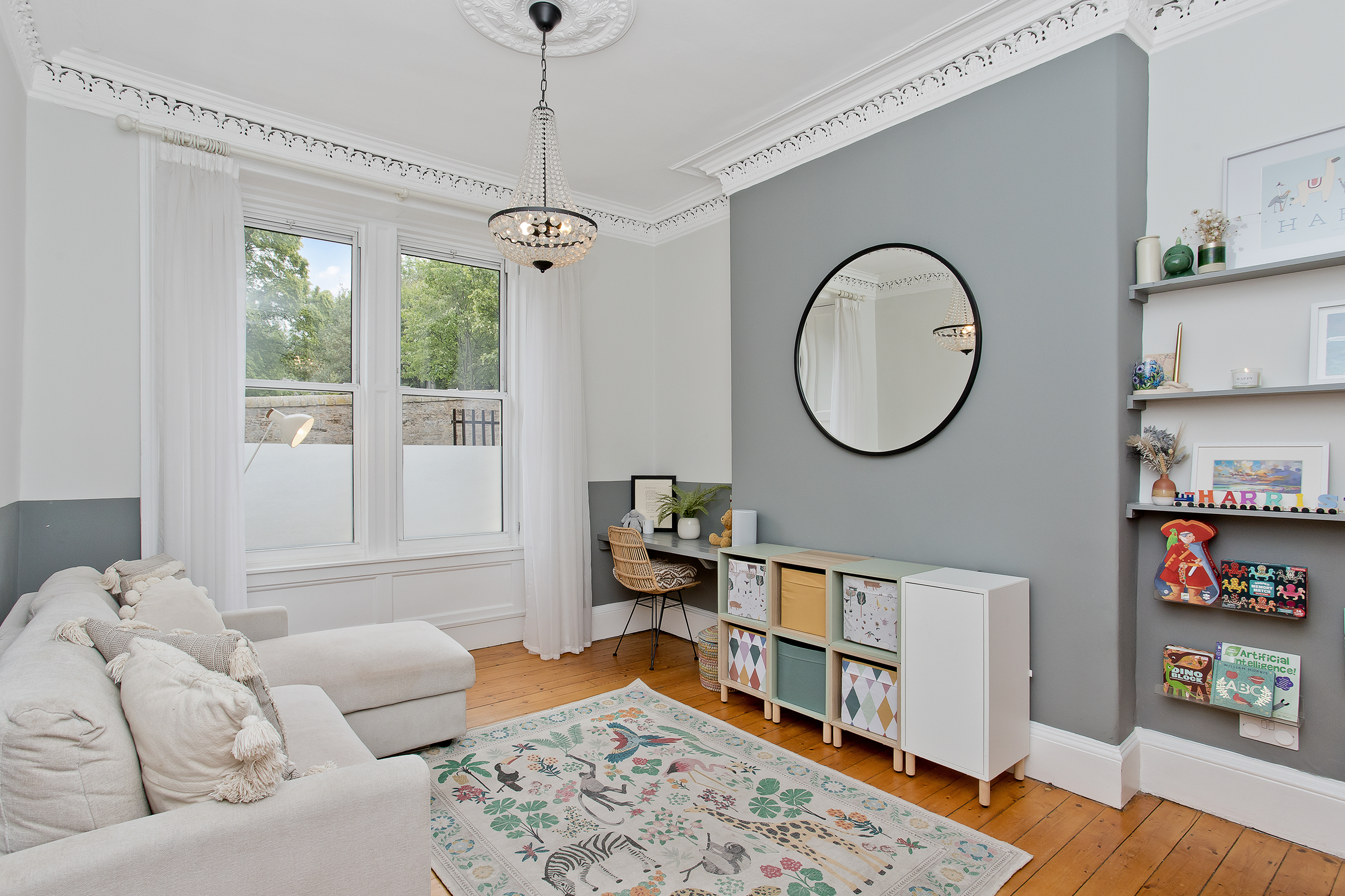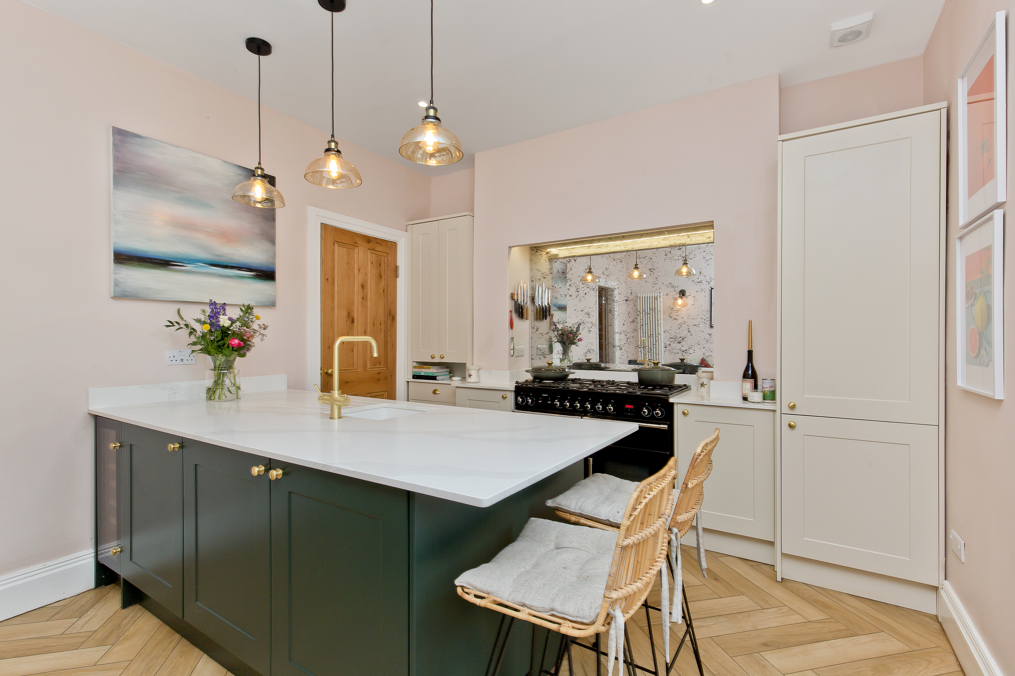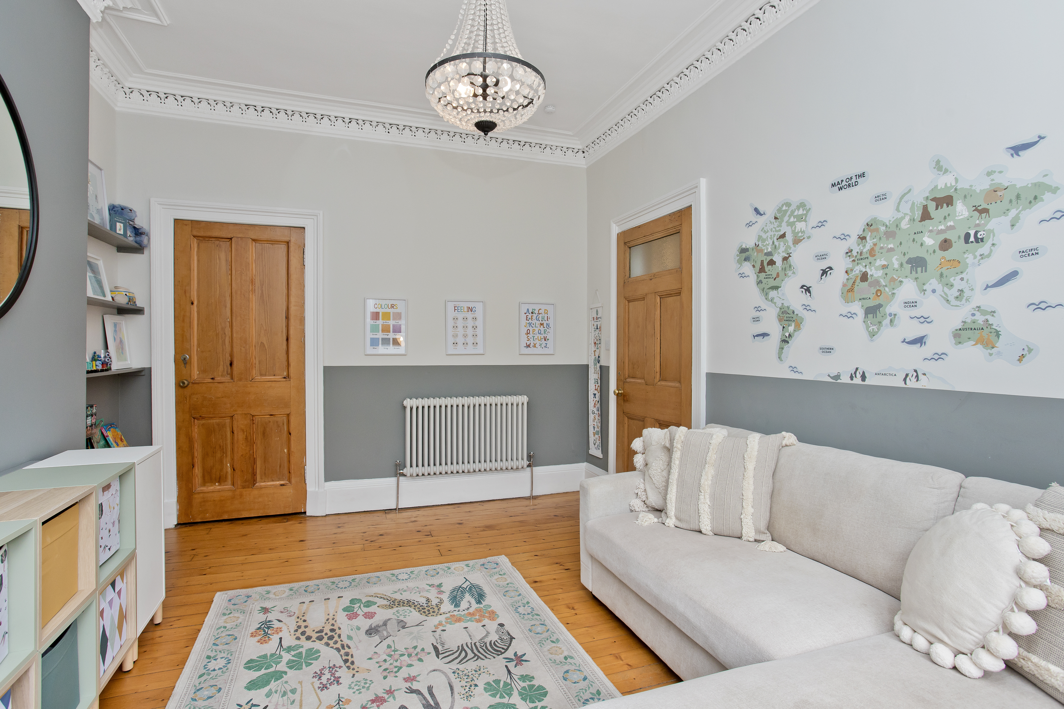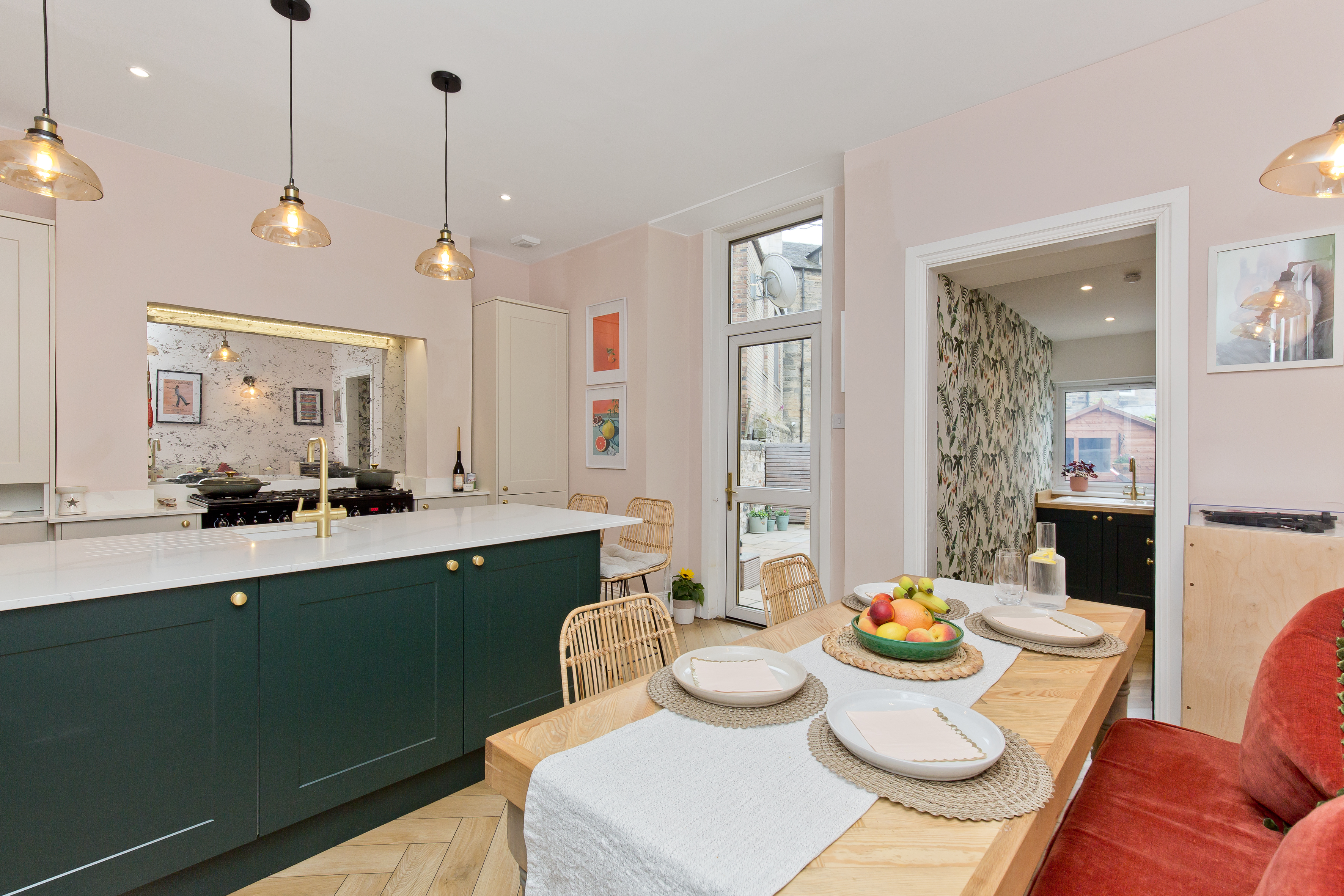 Extending to approximately 1,665 square feet (155 sqm) and arranged over three floors, the accommodation is both generous and well-balanced. On the ground floor, a welcoming entrance vestibule leads into a bright hallway showcasing restored original features, including a striking period staircase. To the front lies a versatile reception room, currently used as a playroom, but equally well-suited as a formal living room or a fourth double bedroom if required. To the rear, the impressive open-plan dining kitchen forms the heart of the home. Thoughtfully designed for modern living, it features bespoke shaker cabinetry, quartz worktops, a large island with seating, integrated appliances and a walk-in pantry cupboard. With direct access to the rear garden, the space is ideal for both everyday family life and entertaining. A stylish utility room and a convenient ground floor WC complete this level.