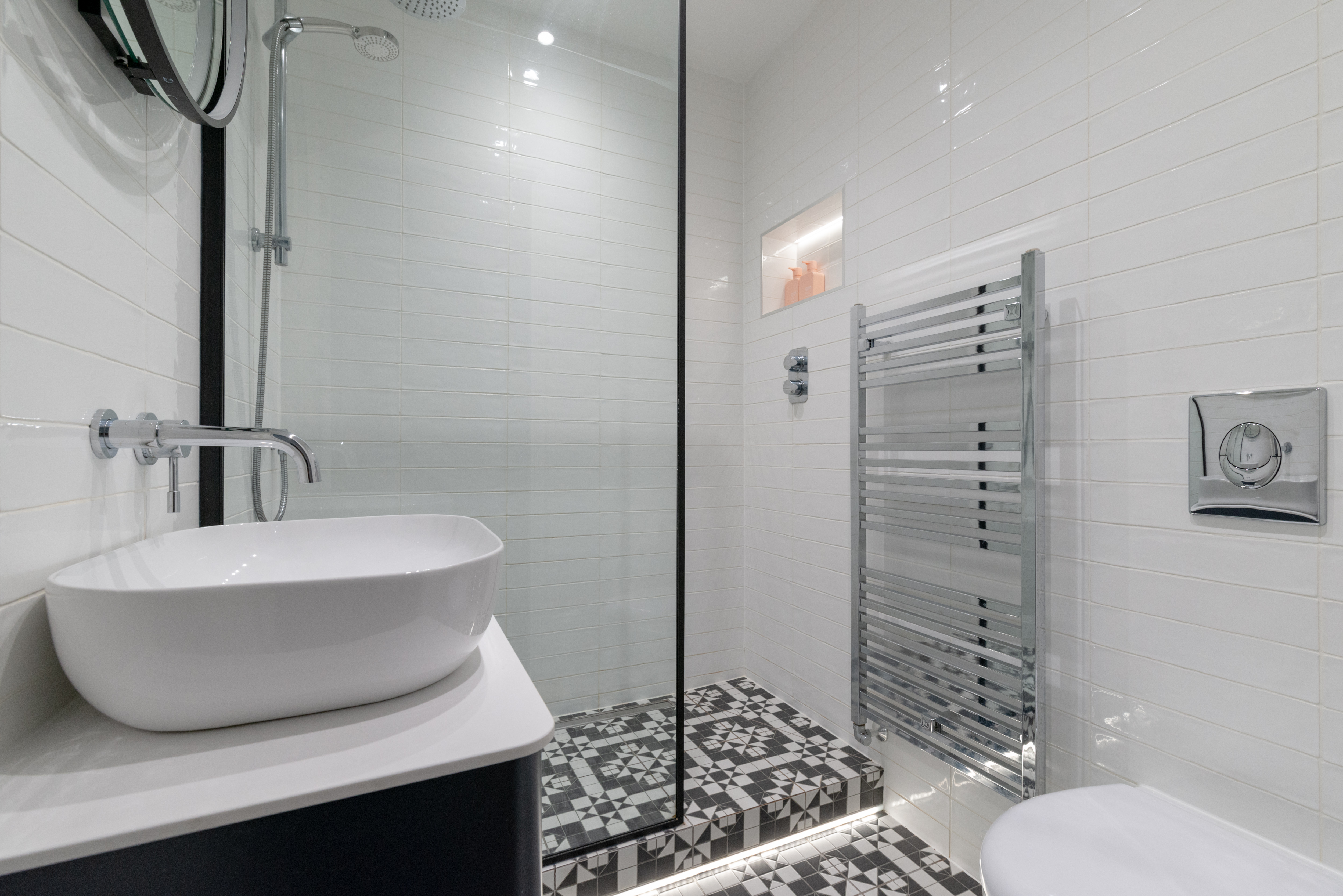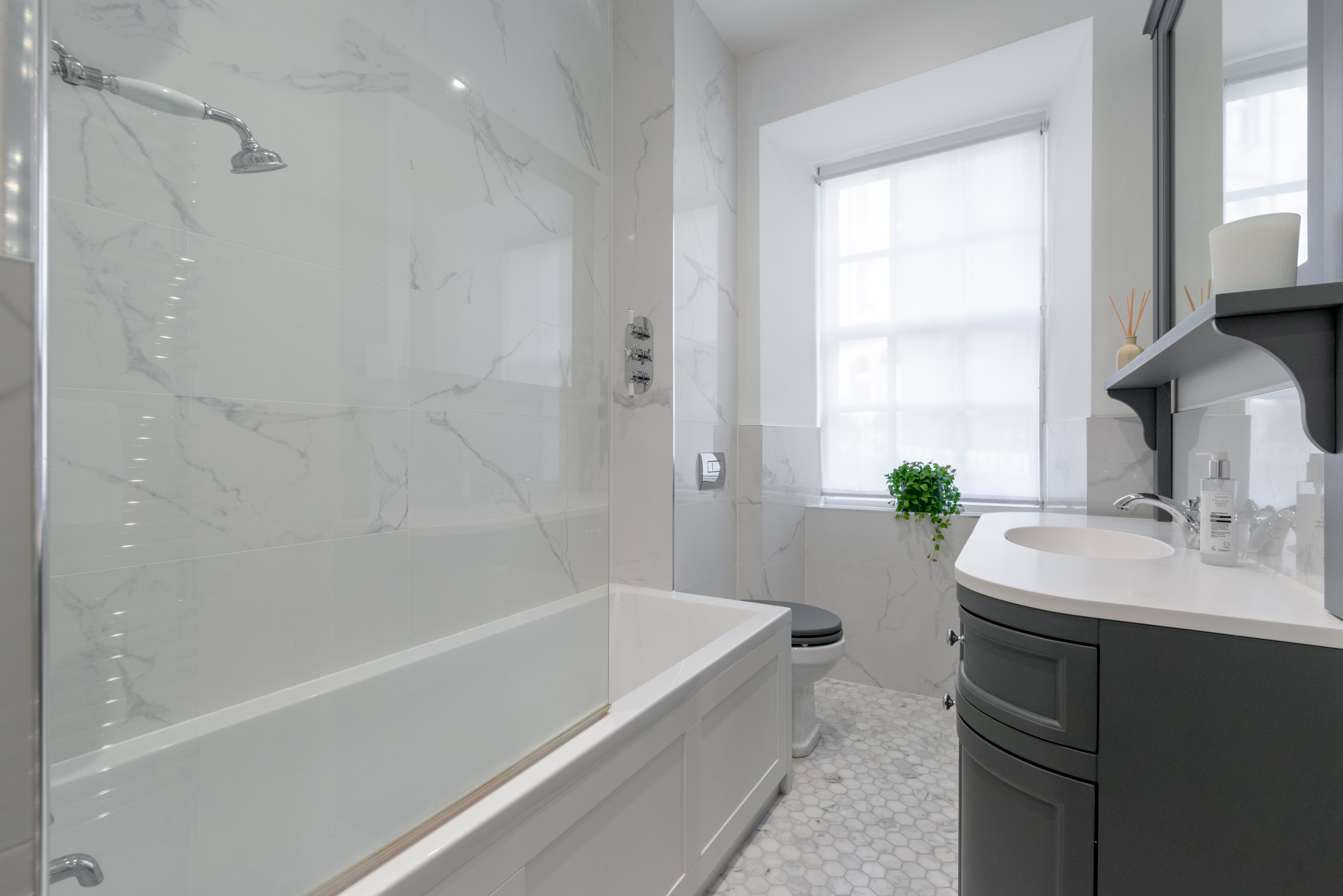 Flooded with natural light from large, dual aspect windows, the master bedroom is a sumptuous space, with an attractive fireplaceand extensive fitted wardrobes.To the rear is a second double bedroom with a feature wall. Located off the second bedroom is a striking, contemporary en-suite with a large walk in shower, WC and wash hand basin. Last but by no means least is the luxurious bathroom with a rainfall shower over the bath, WC and wash hand basin and cabinets below, surrounded by large marble effect ceramic wall tiles and hexagonal mosaic marble floor tiles.