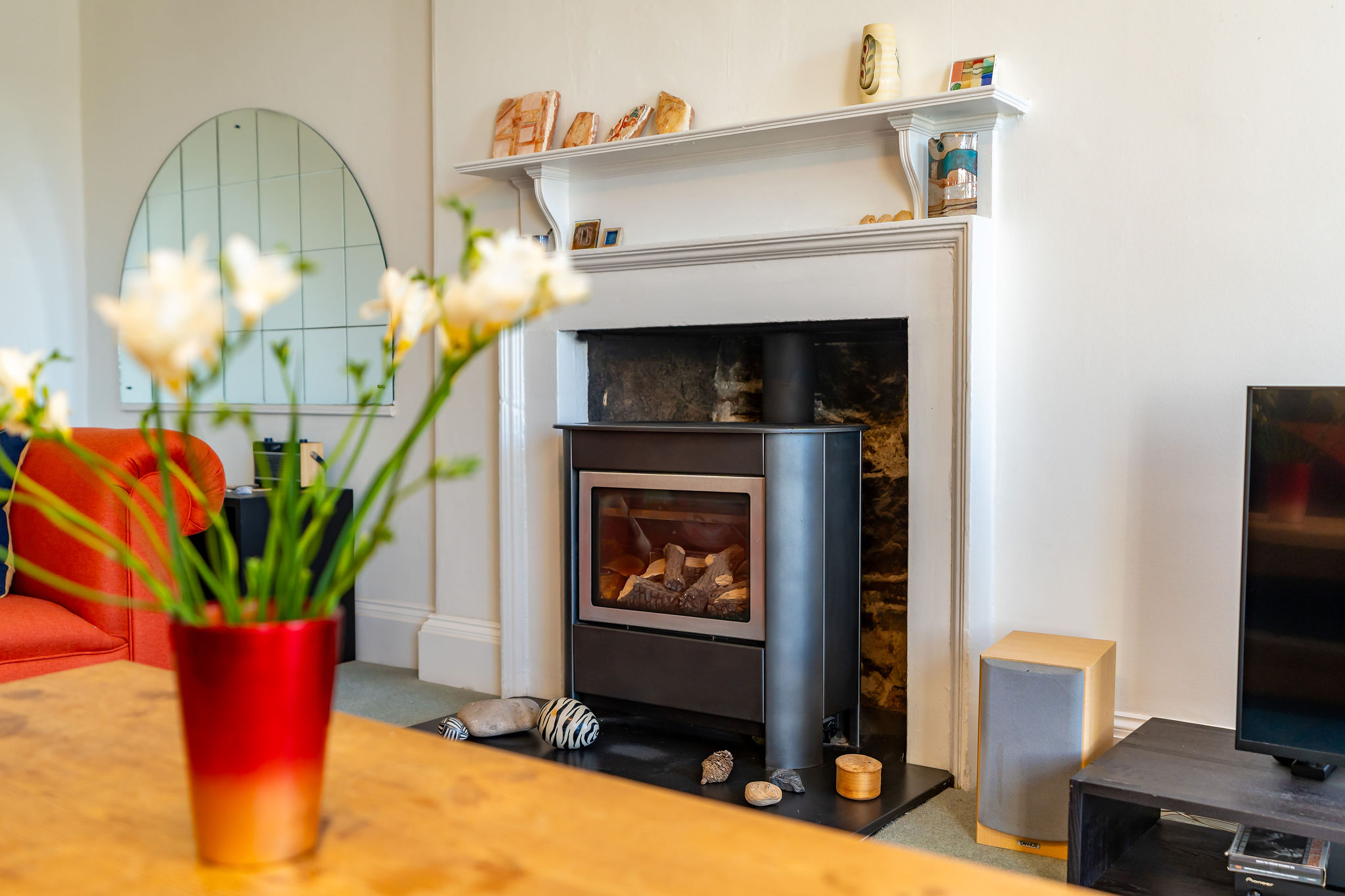 Upon entering the home, there is a versatile open space that would be well-suited as a study or simply an ample entryway. Straight ahead is the spacious, twin-windowed sitting room which features a wonderful gas stove. The stylish kitchen is nextdoor, and is fitted with integrated appliances, a handy clothes drying pulley and two large pantry style cupboards. A unique attribute to this home is the substantial dining room which is flooded with light by the overhead, triple glazed skylight. There is also excellent storage available below the dining room, accessible via a concealed hatch. The principal bedroom, which has delightful rooftop views, also boasts a contemporary en suite and built-in cupboard. There are two further double bedrooms and a family bathroom fitted with Heritage sanitaryware and a handcrafted Dutch door.