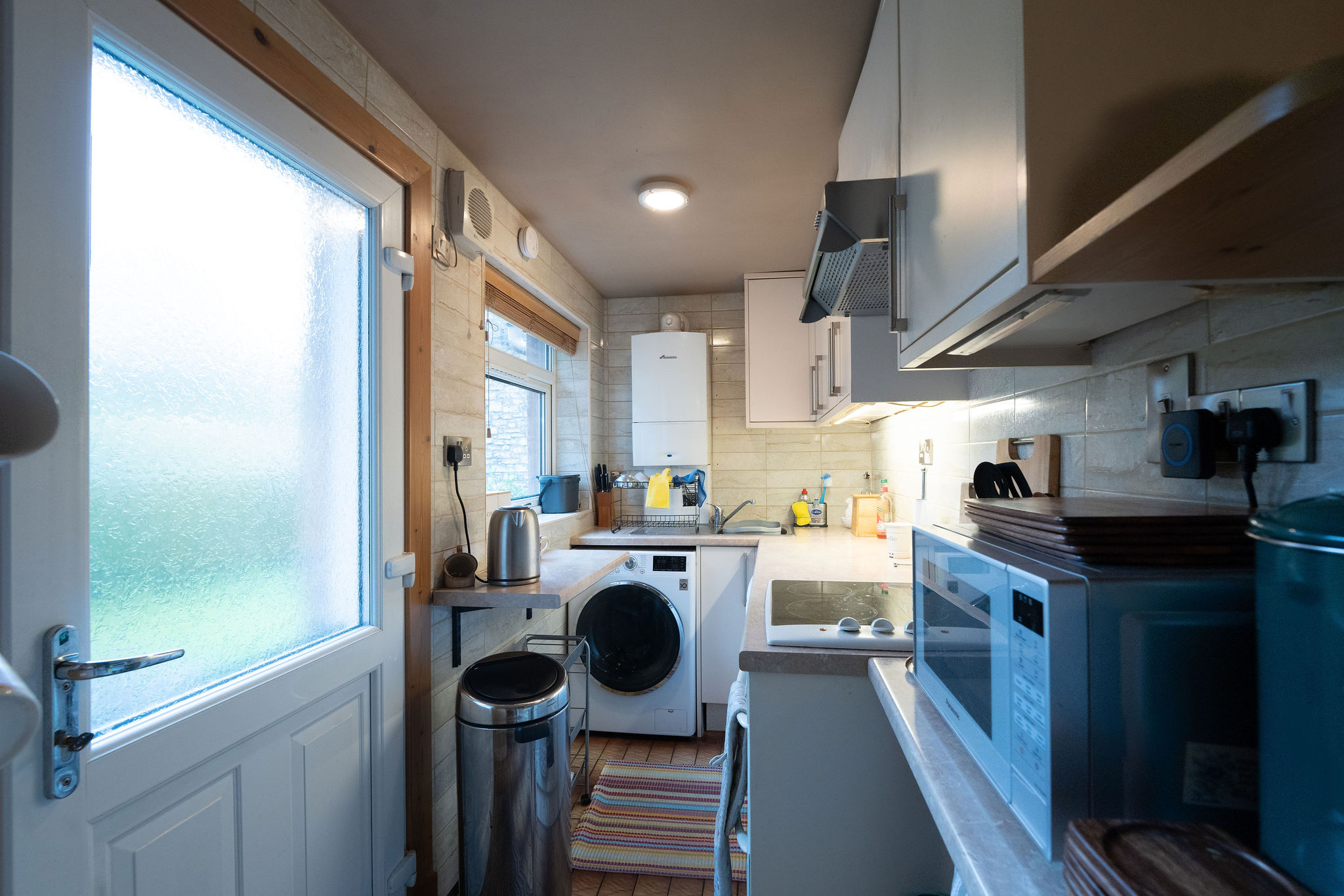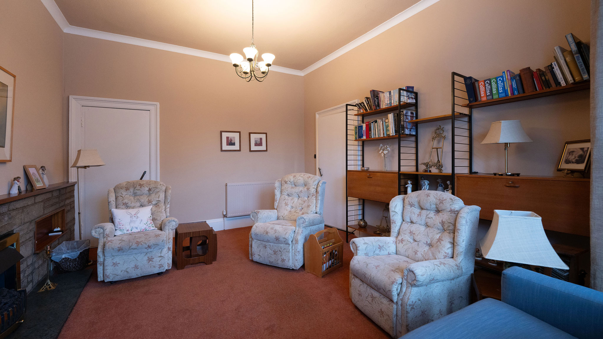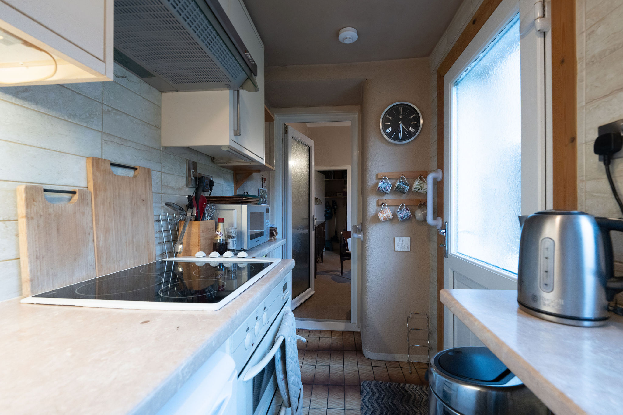 Internally the property comprises: charming entryway and central hall with fantastic storage; large sitting room with bay window and electric fire; spacious dining room with large storage space; galley kitchen with wall and base mounted units and access to the rear garden; two double bedrooms and a three-piece shower room.