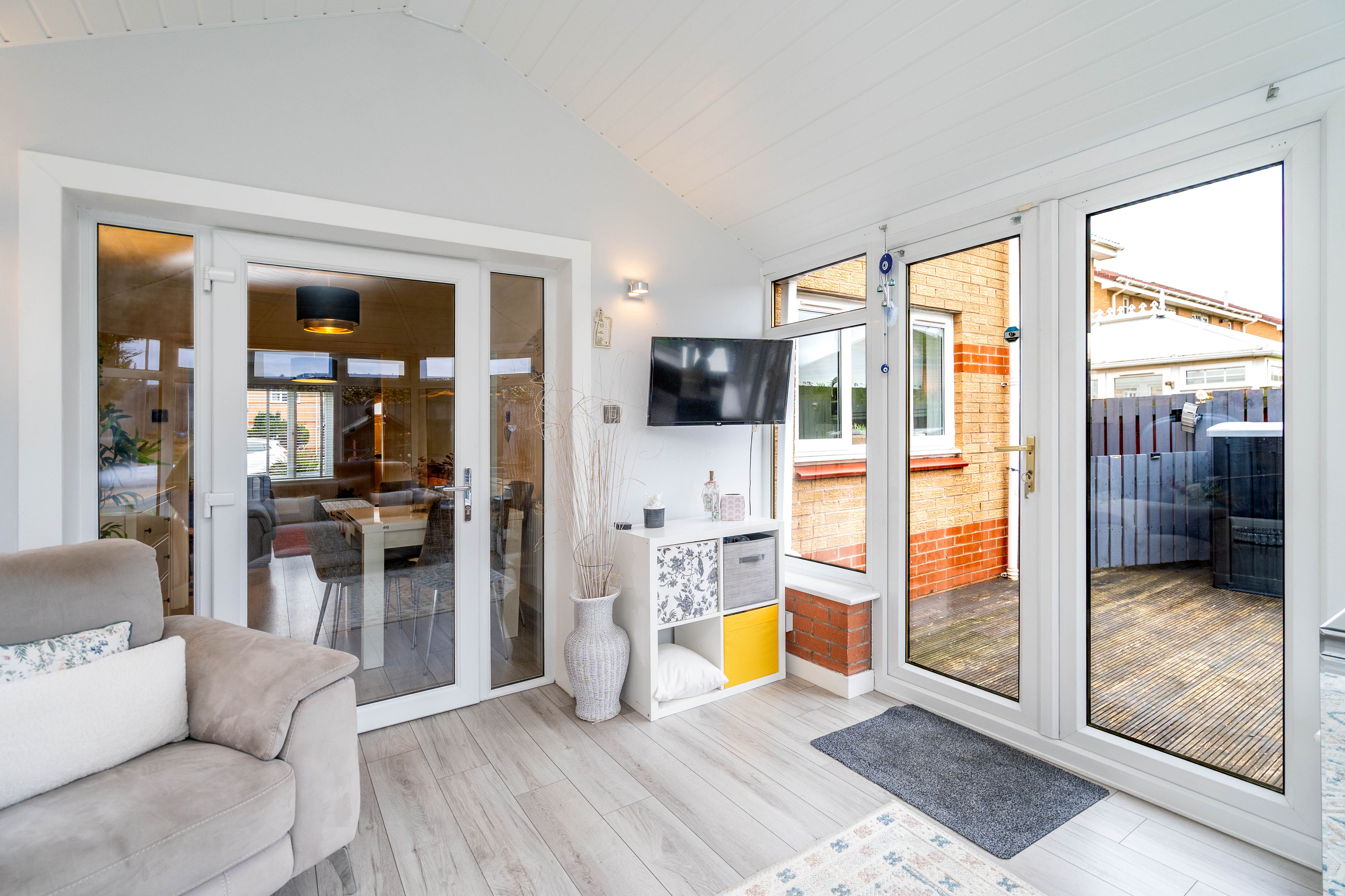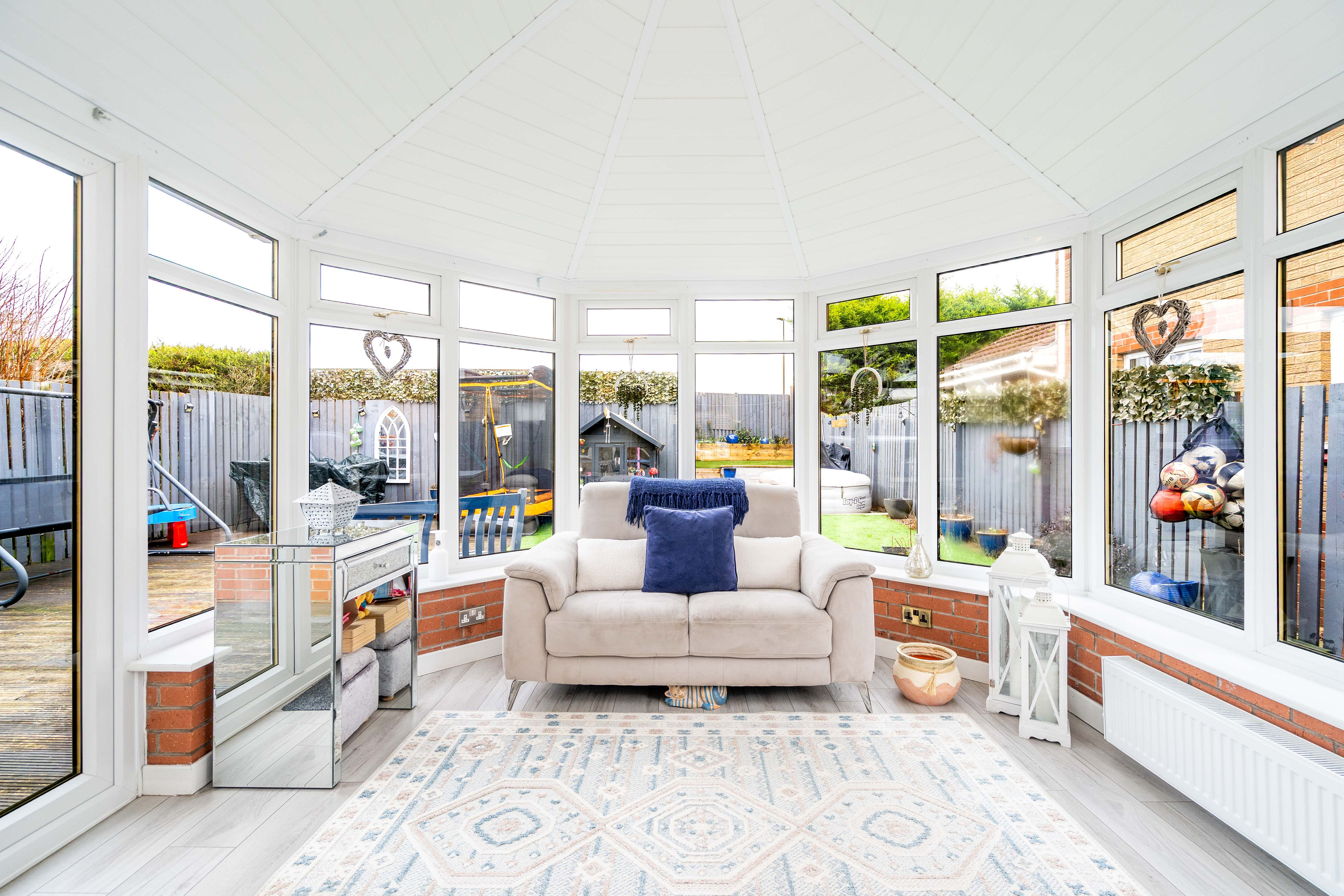 At the heart of the home is a generous open-plan sitting and dining area, where natural light floods through and creates an inviting space for both everyday living and entertaining. This flows seamlessly through to a conservatory that enjoys direct access to the private rear garden, extending the living space outdoors and offering a wonderful spot for alfresco dining or relaxation.