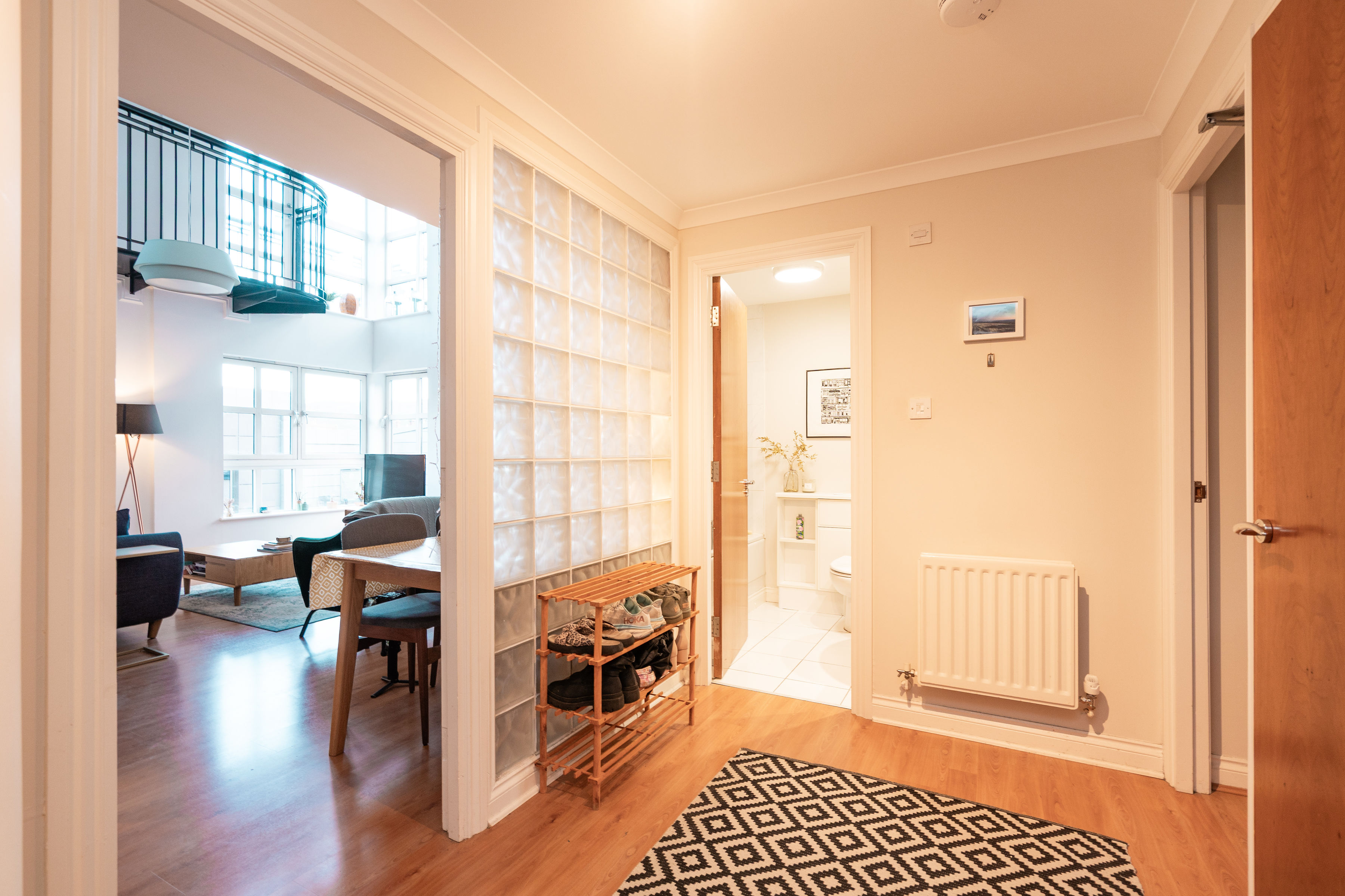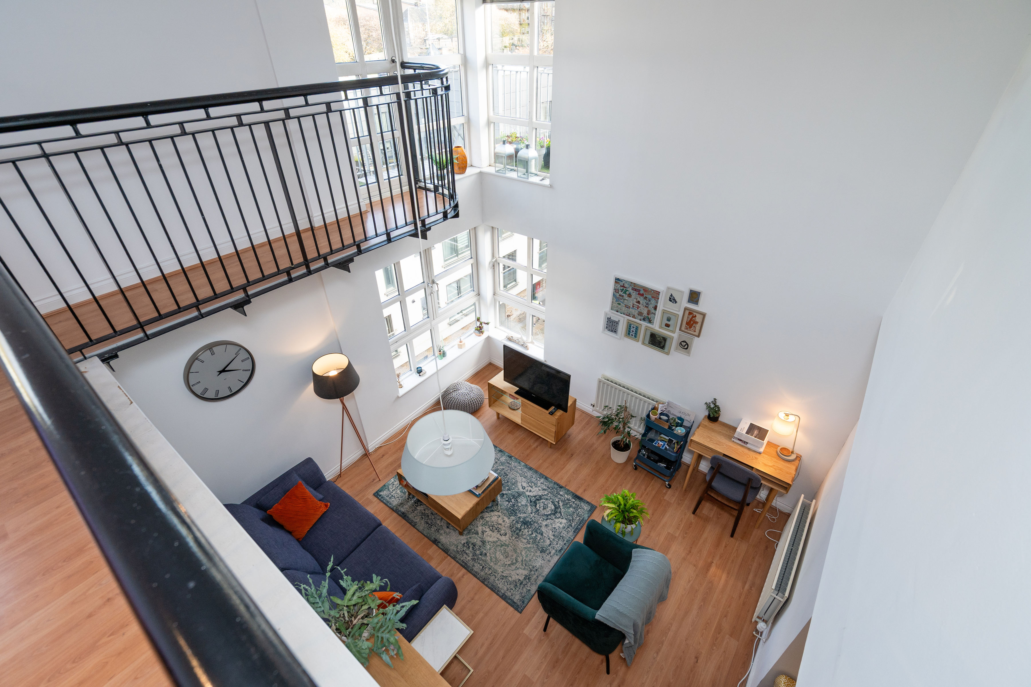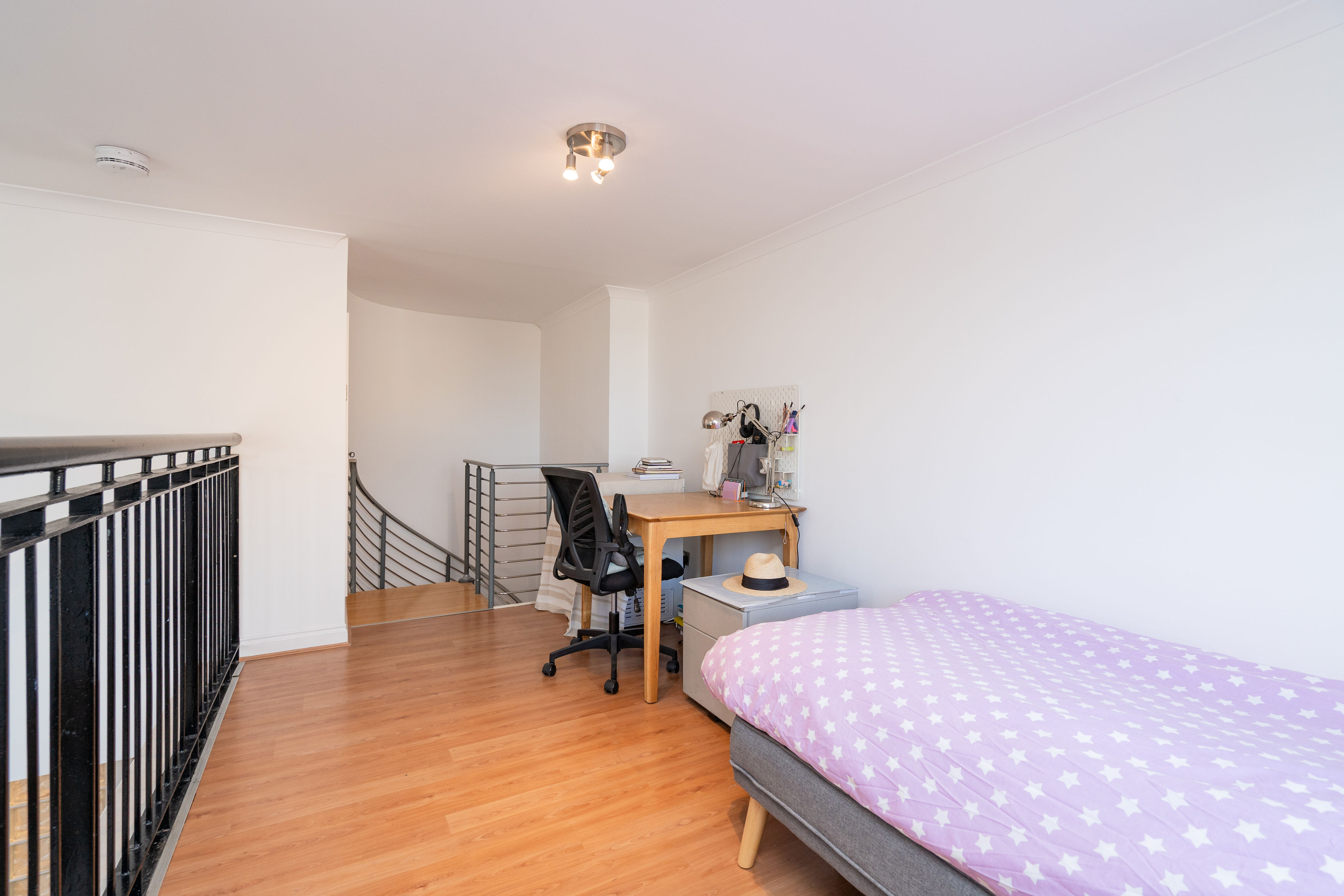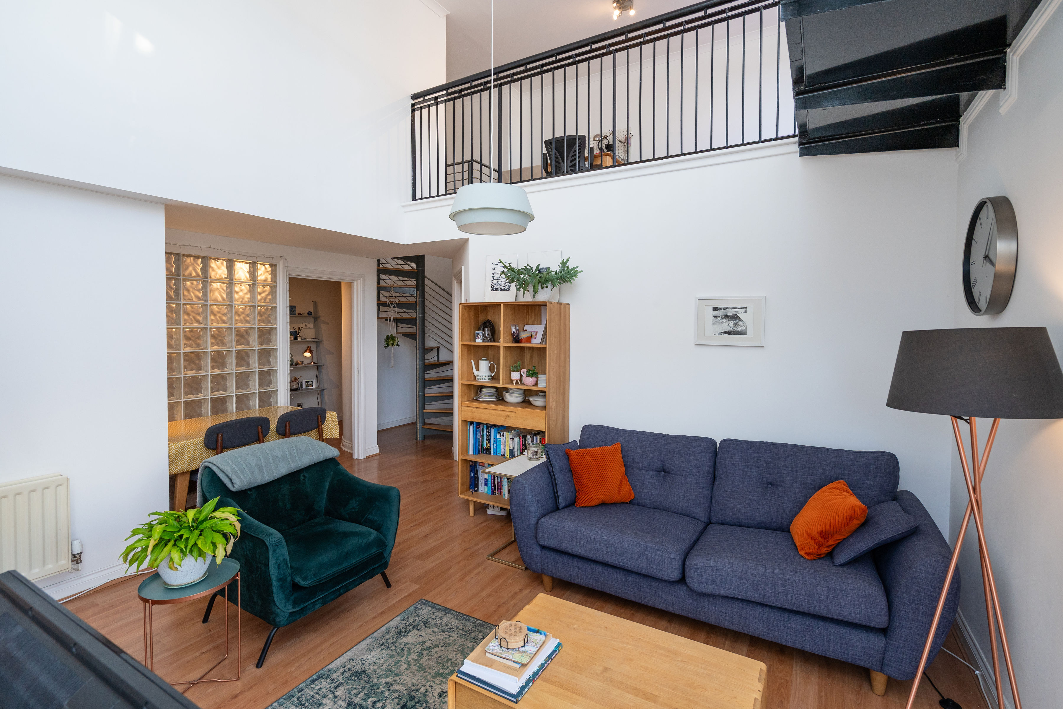 Off the sitting room lies a sleek, modern kitchen, thoughtfully designed with ample storage and workspace. From the sitting room, a staircase leads to the mezzanine level, perfect for an office space, where the private balcony offers an elevated vantage point to fully appreciate the stunning views of Edinburgh’s skyline and surrounding landmarks.