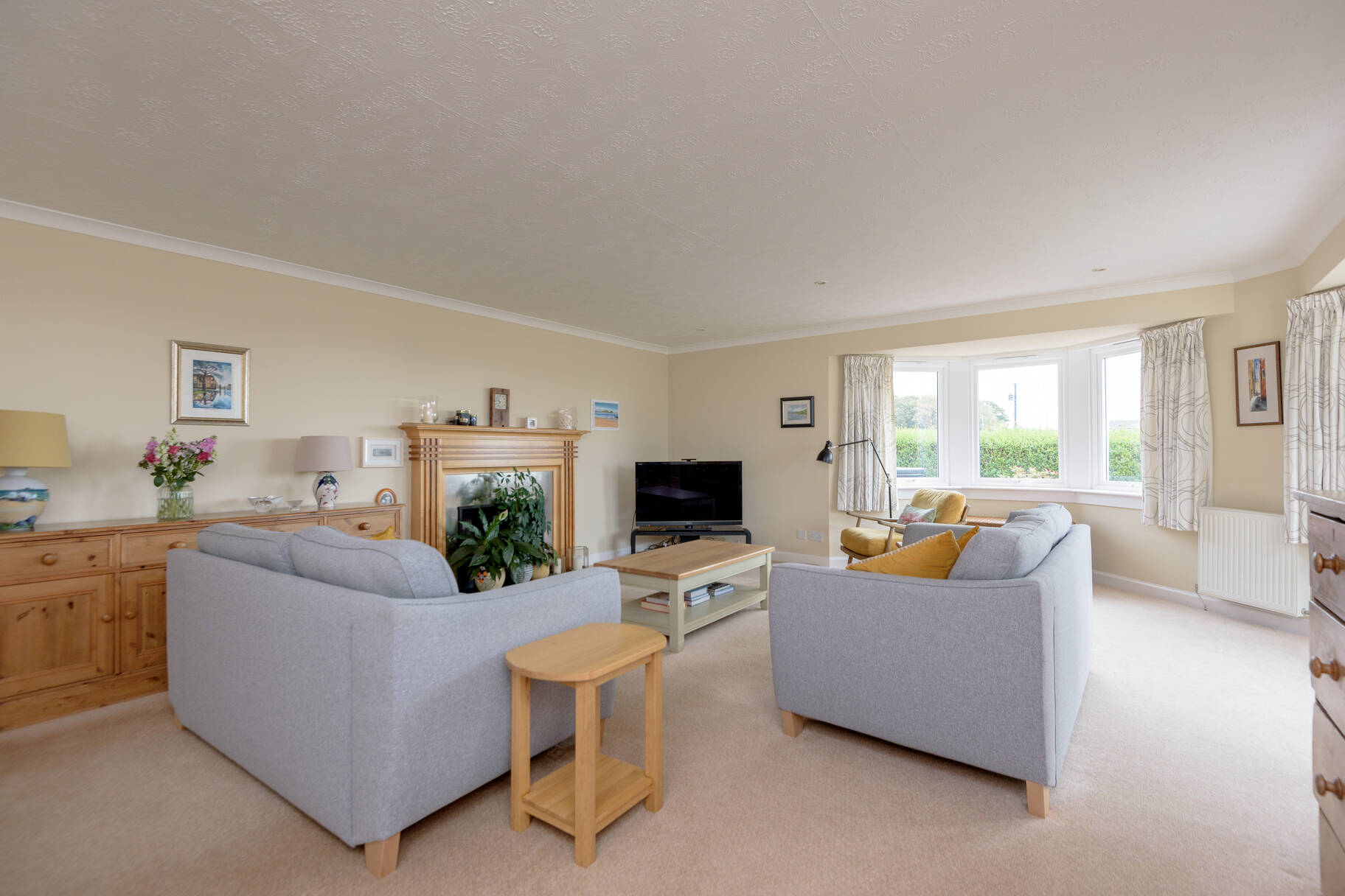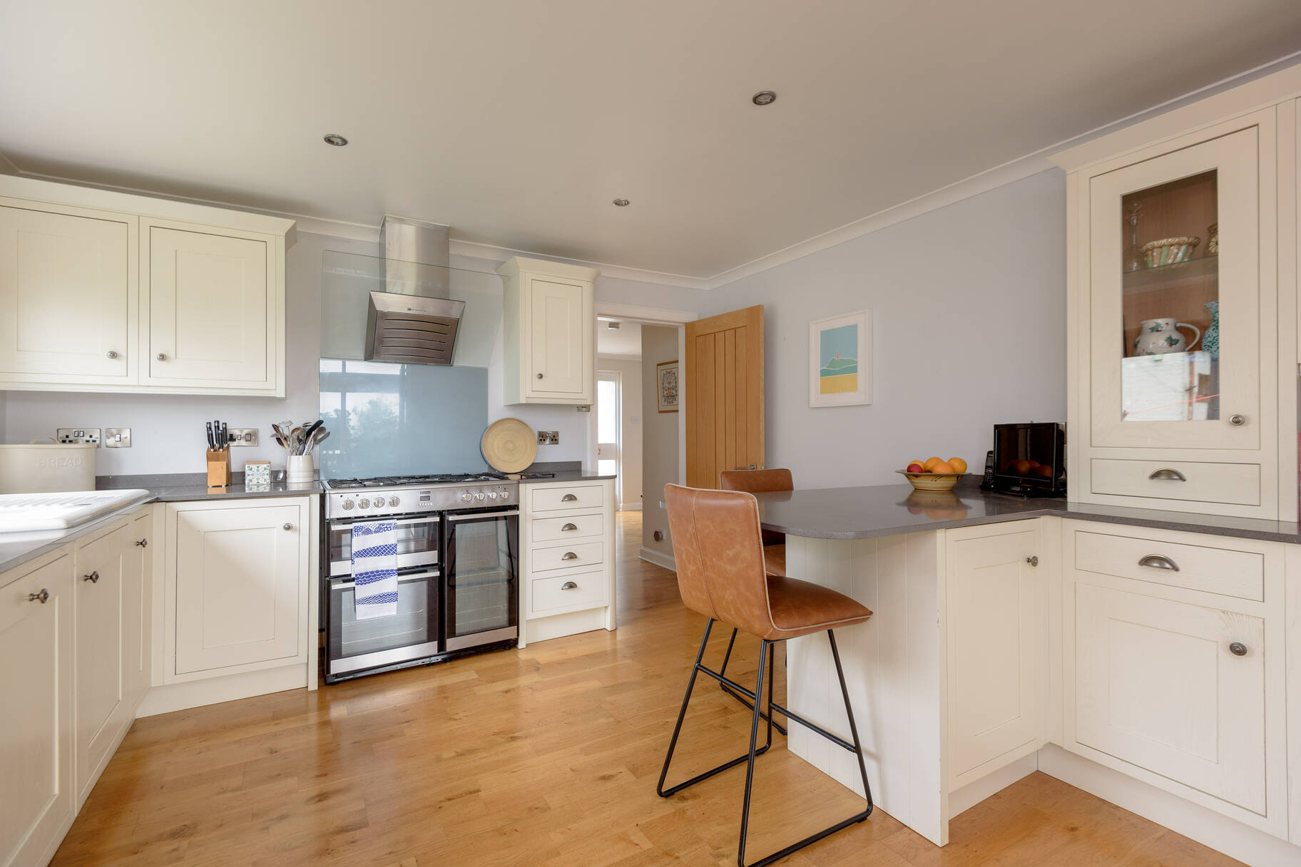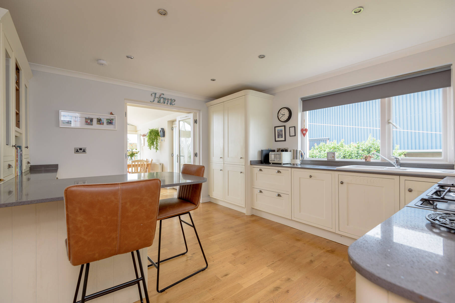The spacious and flexible accommodation is arranged over two floors and thoughtfully designed for modern living. On the ground floor, a welcoming entrance hallway offers generous storage. The bright and comfortable sitting room benefits from a gas fire and open views, while the stylish breakfasting kitchen features a gas range cooker, breakfast bar, and a range of fitted units. A separate utility room adds practicality.