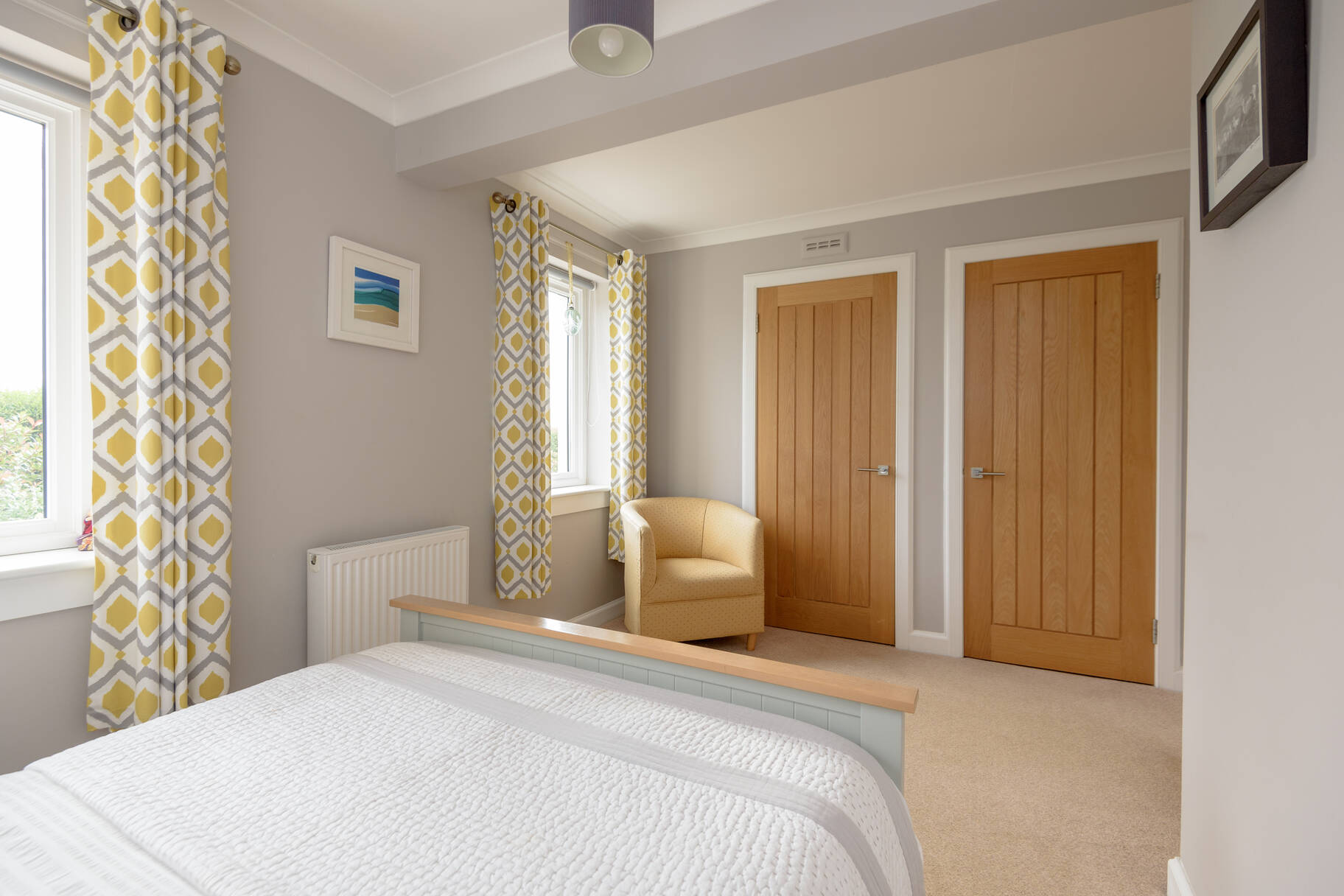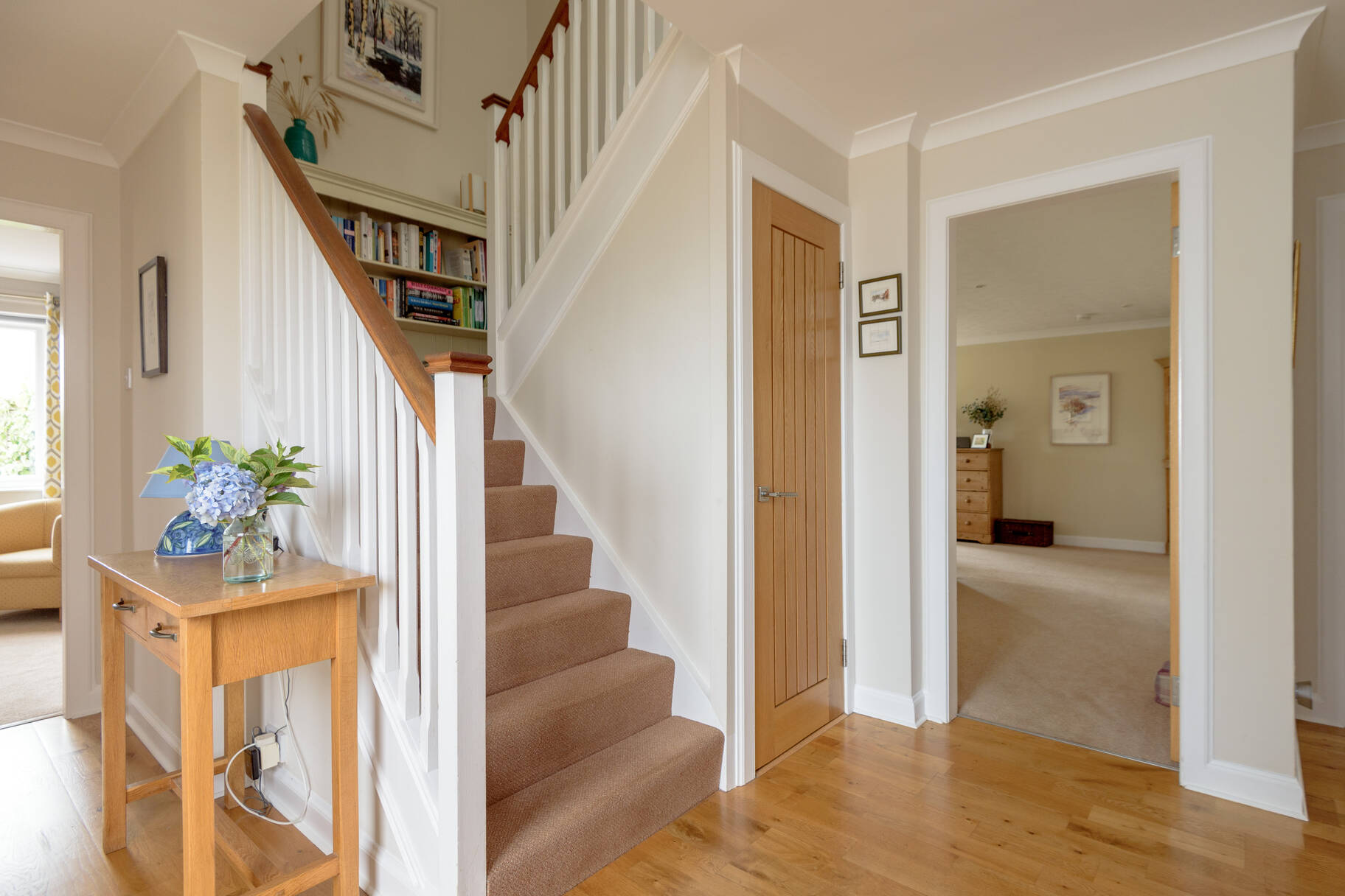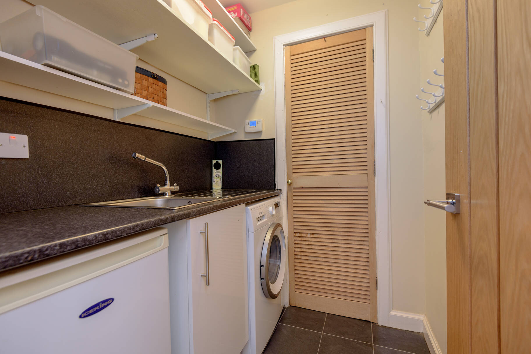The spacious and flexible accommodation is arranged over two floors and thoughtfully designed for modern living. On the ground floor, a welcoming entrance hallway offers generous storage. The bright and comfortable sitting room benefits from a gas fire and open views, while the stylish breakfasting kitchen features a gas range cooker, breakfast bar, and a range of fitted units. A separate utility room adds practicality.