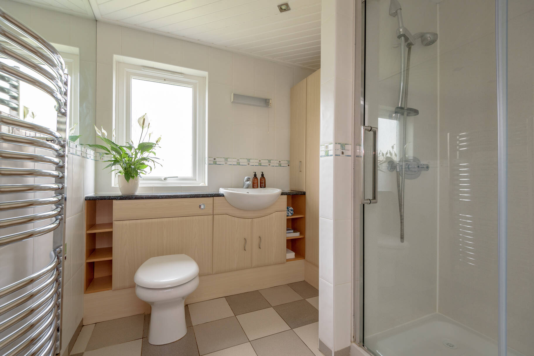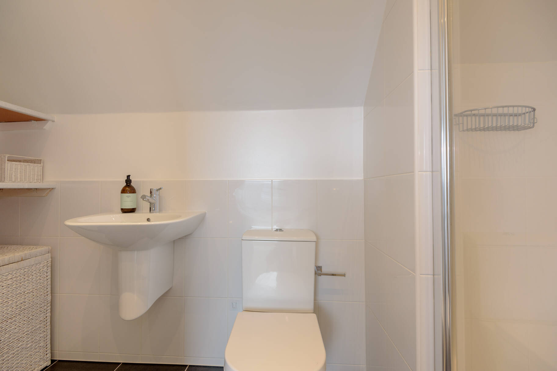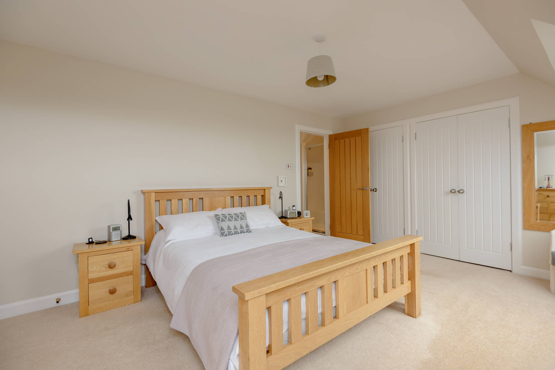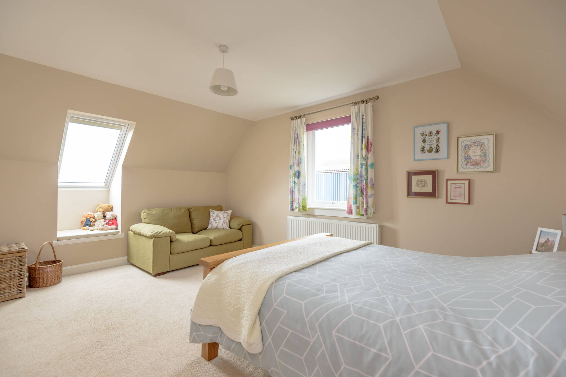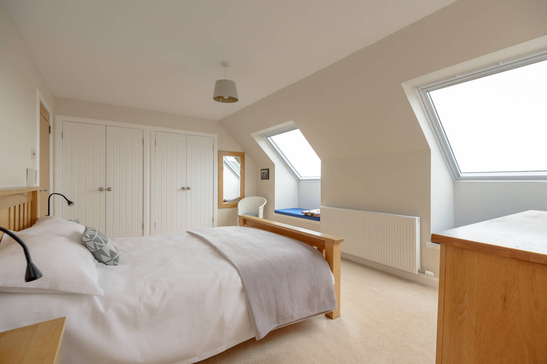 Upstairs, the principal bedroom includes fitted double wardrobes, Velux windows, and a contemporary en-suite shower room. A further generously sized double bedroom with Velux windows completes the upper level.