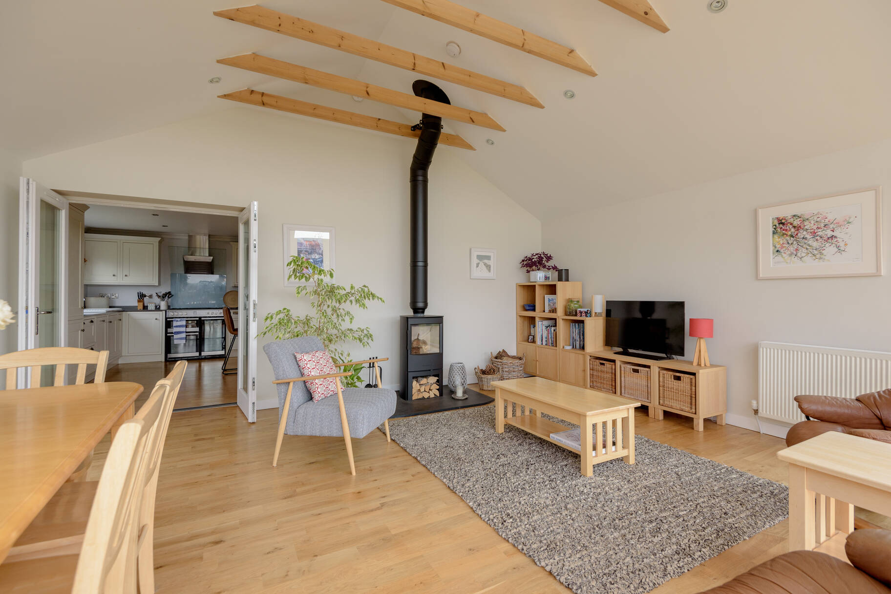 The heart of the home is the expansive family room which provides a light-filled space with a wood-burning stove, sliding doors to the garden, and spectacular outlook across the surrounding countryside. Also on the ground floor are a double bedroom with built-in storage, a modern shower room, and a useful study/bedroom 4.