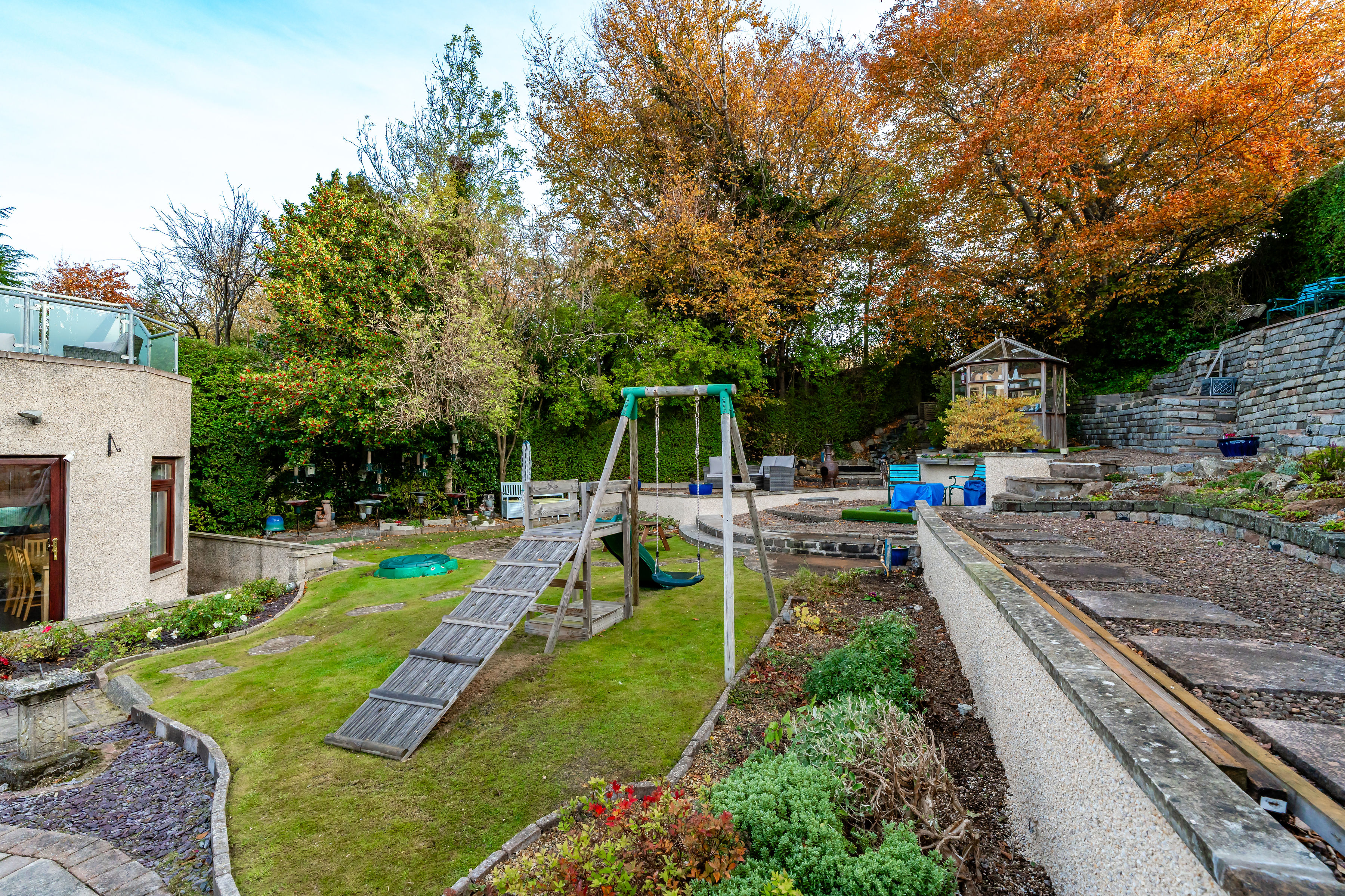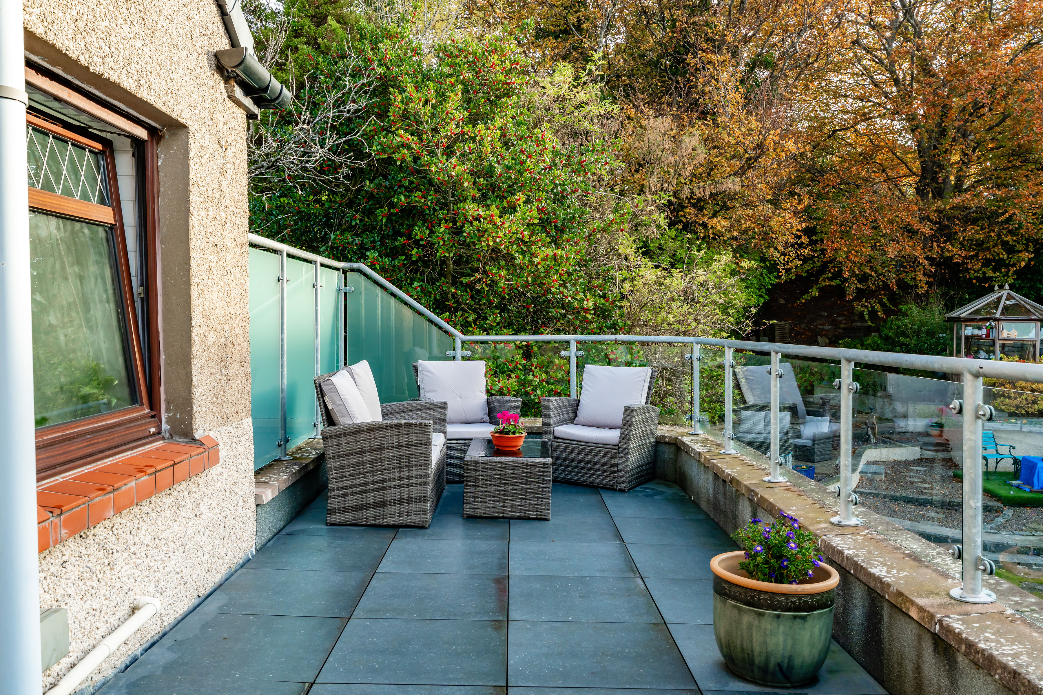 - Delightful gardens and balcony with a view.
