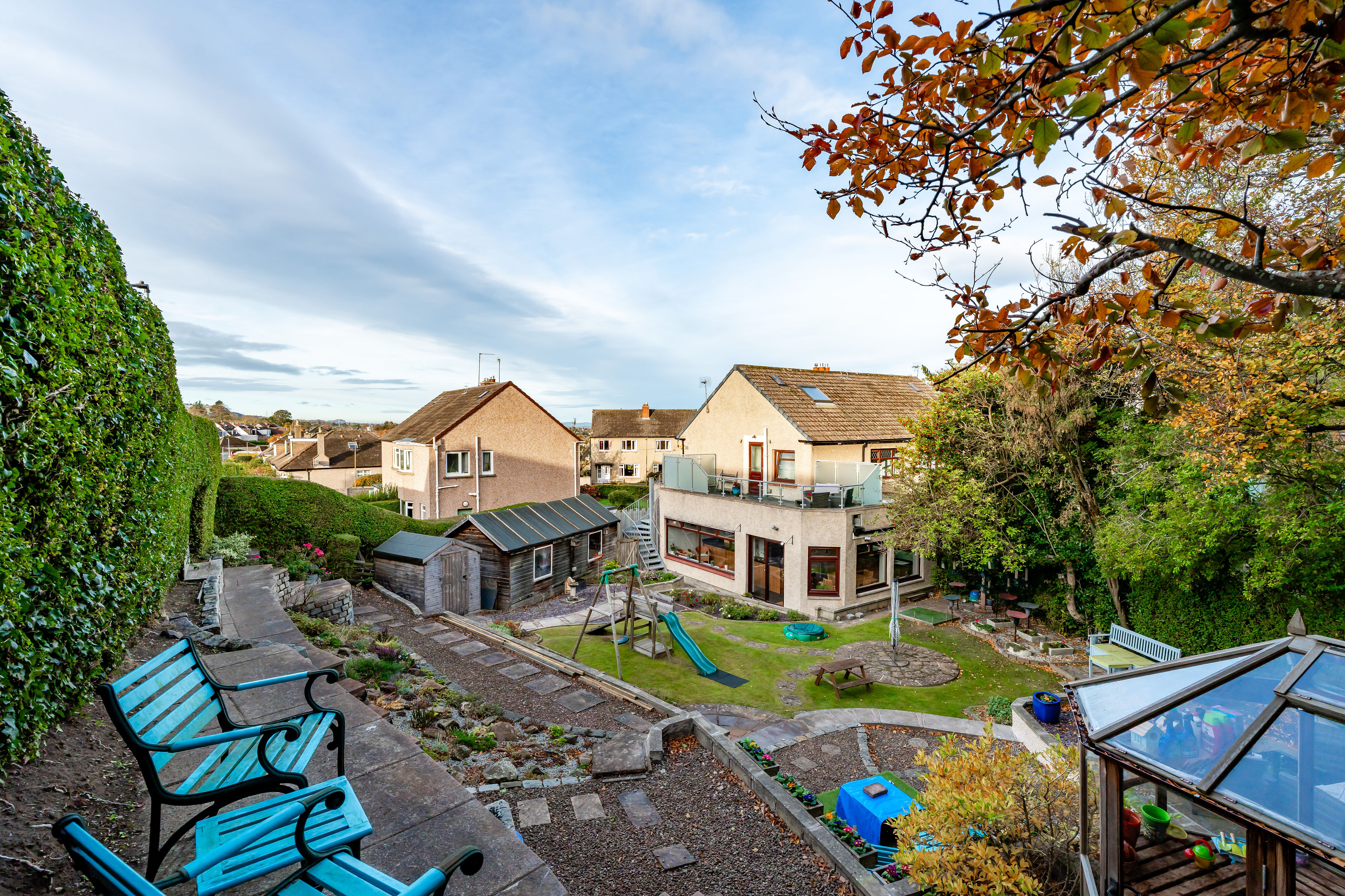 The south-facing rear garden is a real highlight. Thoughtfully landscaped and beautifully maintained, it features a greenhouse, raised seating areas and mature planted beds, creating a tranquil setting for outdoor living. A balcony, accessed from the first floor, is large enough for dining and offers wonderful open views. To the front, a private driveway provides ample off-street parking and there is also a timber garage.