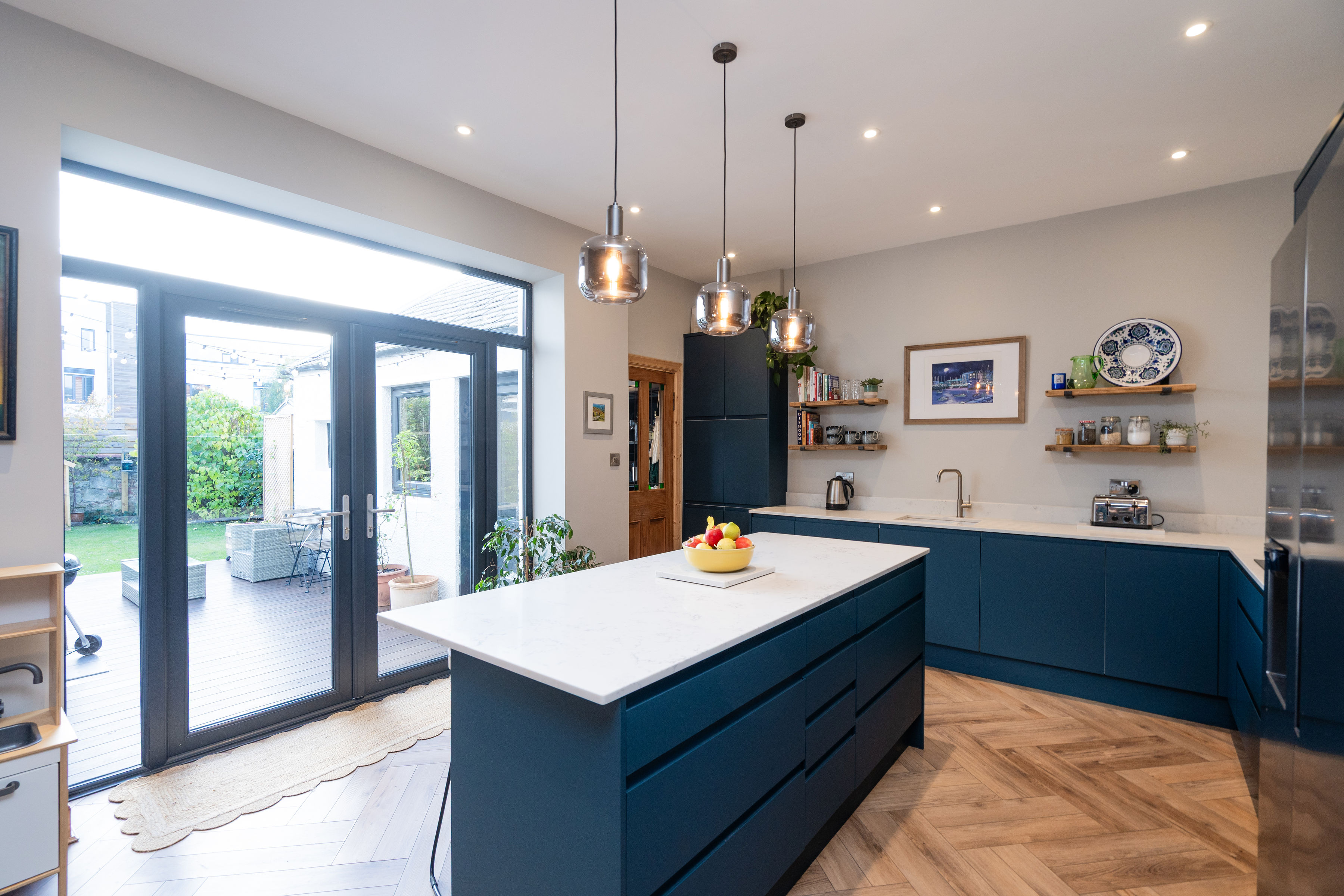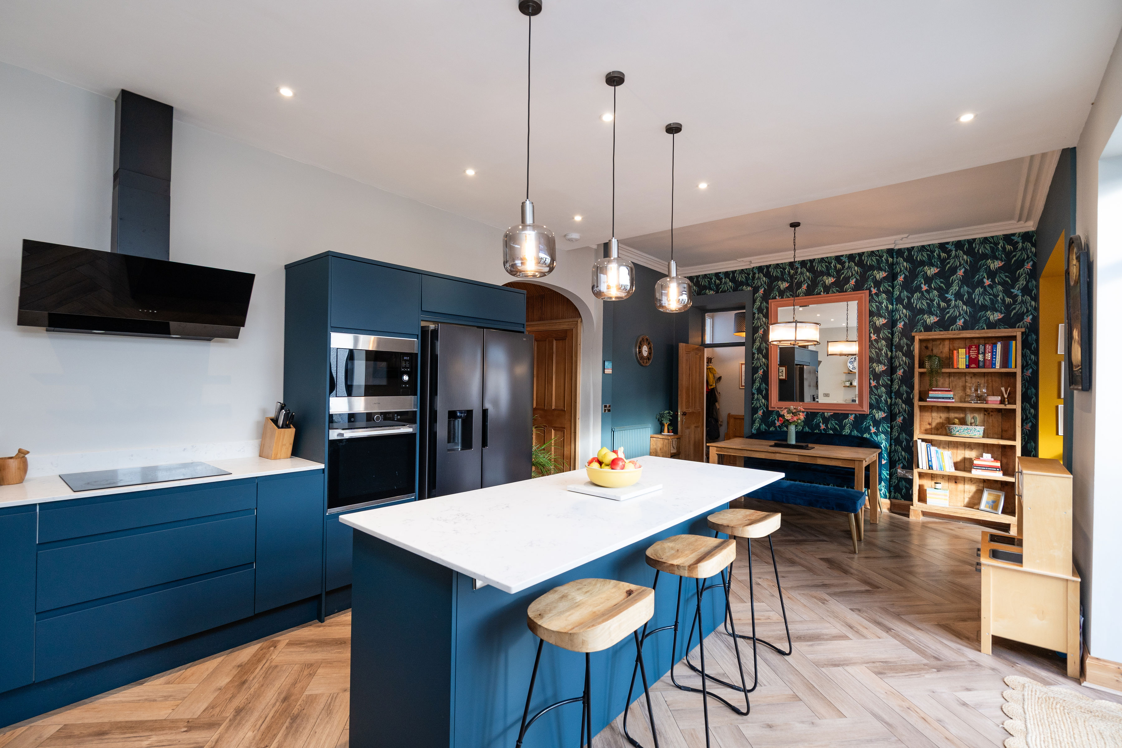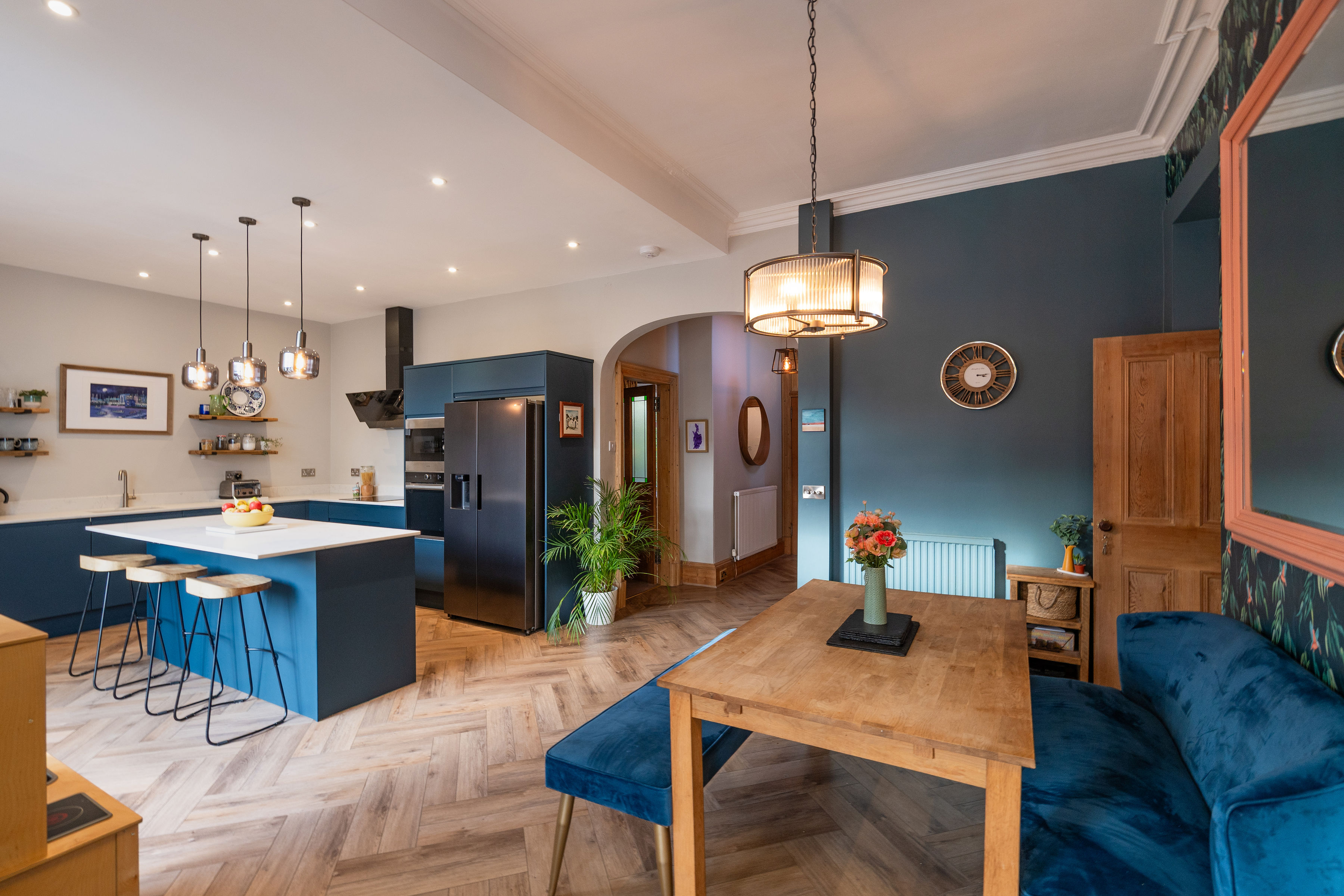 Inside, the home offers versatile living spaces designed for both family life and entertaining. A large sitting room with bay window and a log-burning stove creates a warm and inviting focal point, while a conveniently located bathroom on the ground floor adds practicality for everyday use. The heart of the home unfolds in a superb open-plan layout where the family room flows effortlessly into the dining space and the kitchen, with a utility room discreetly positioned off to keep chores organised and out of sight.