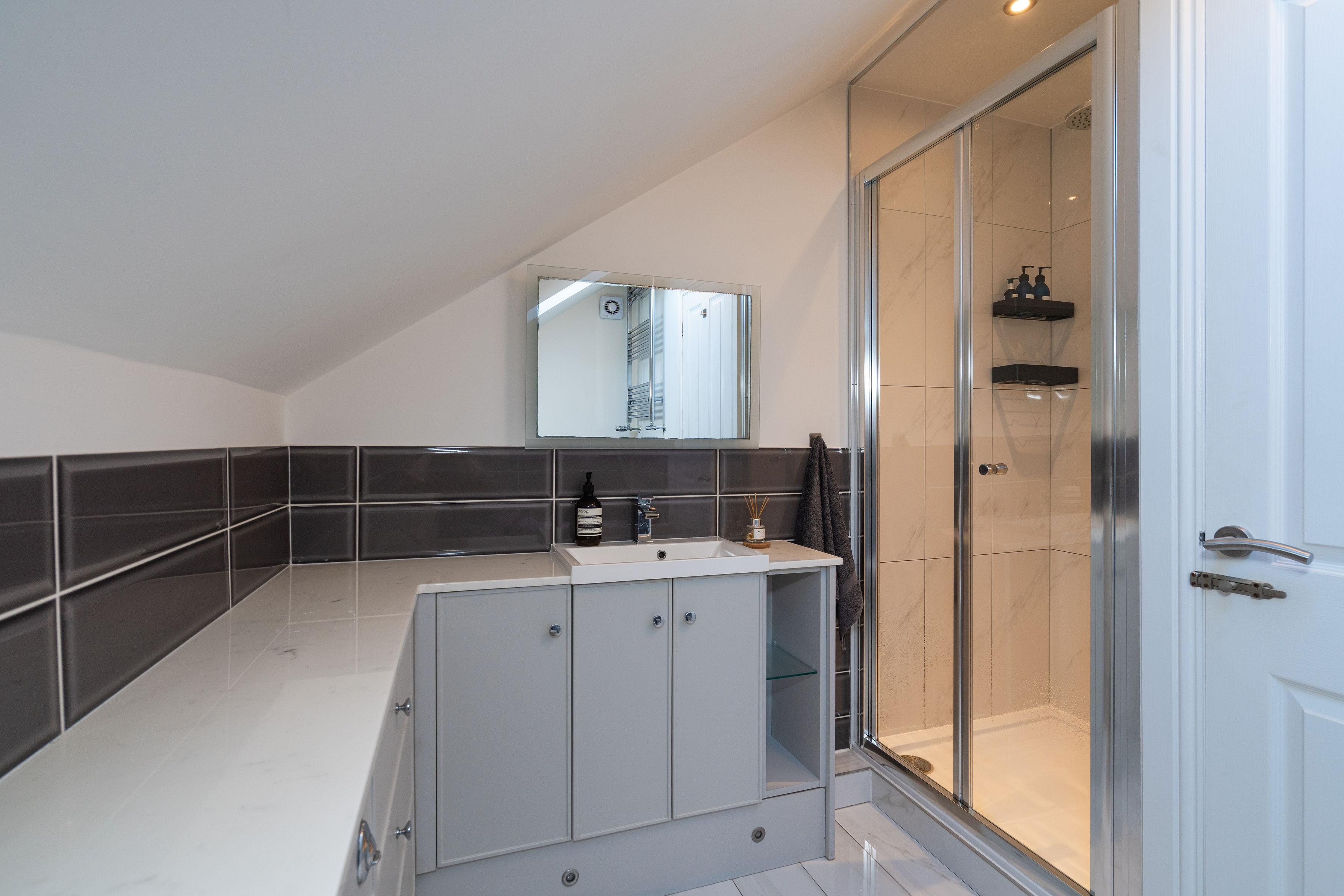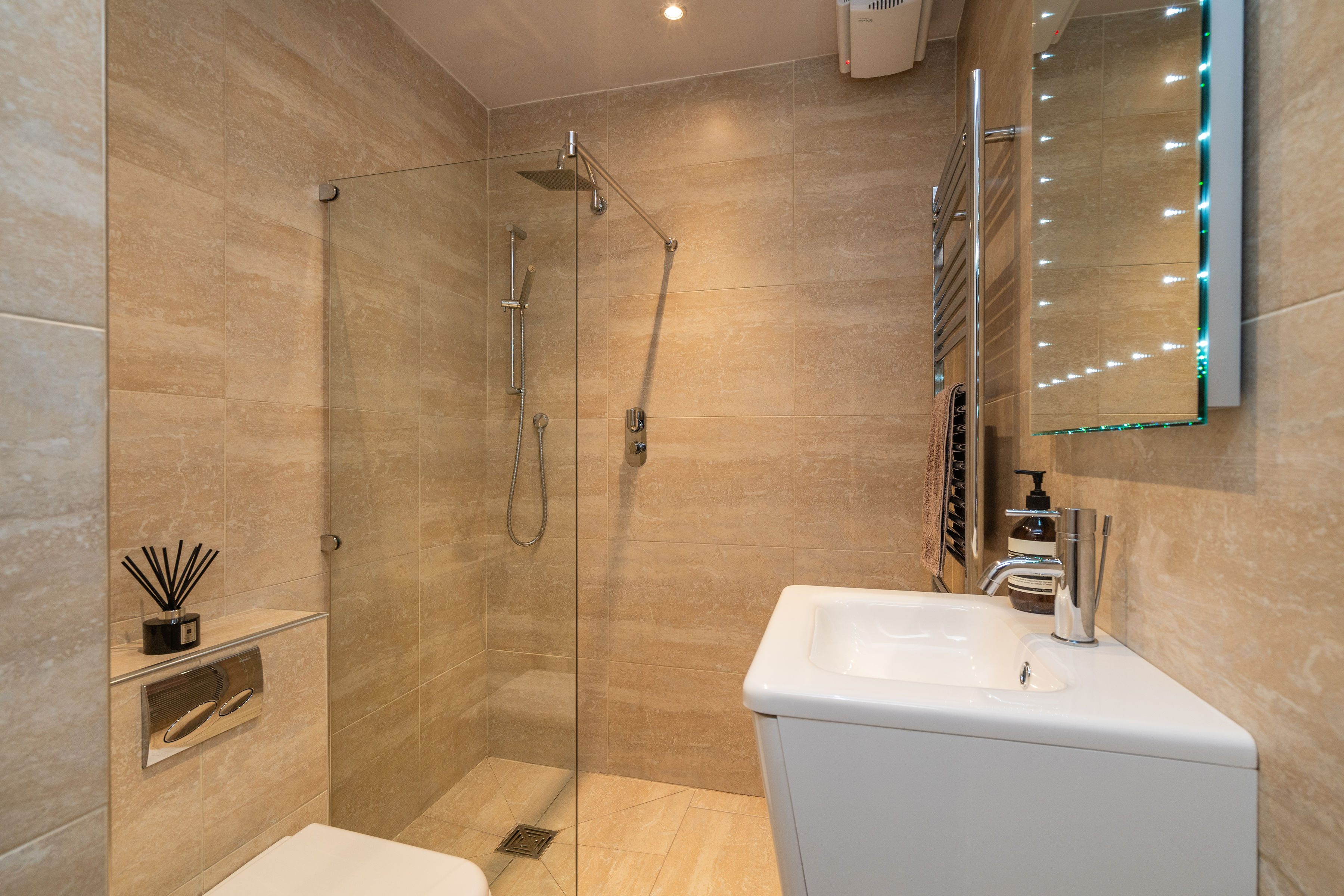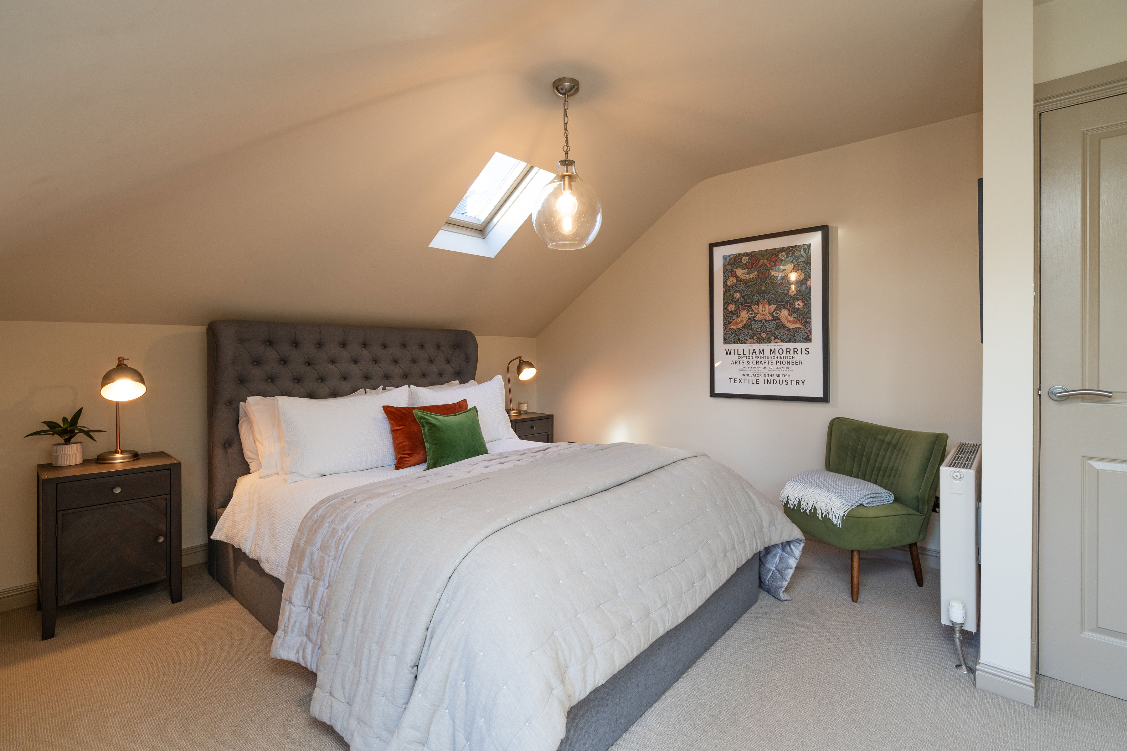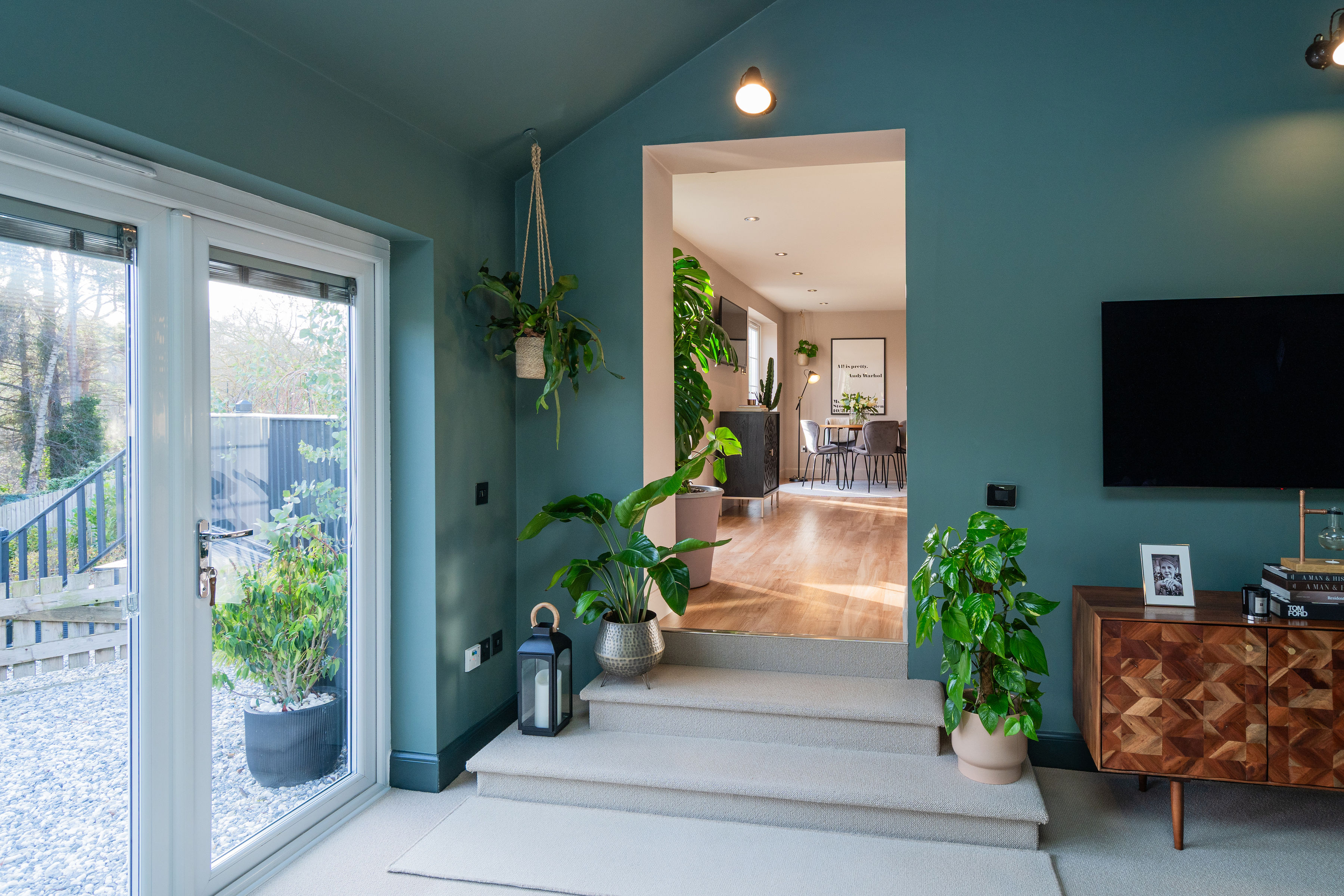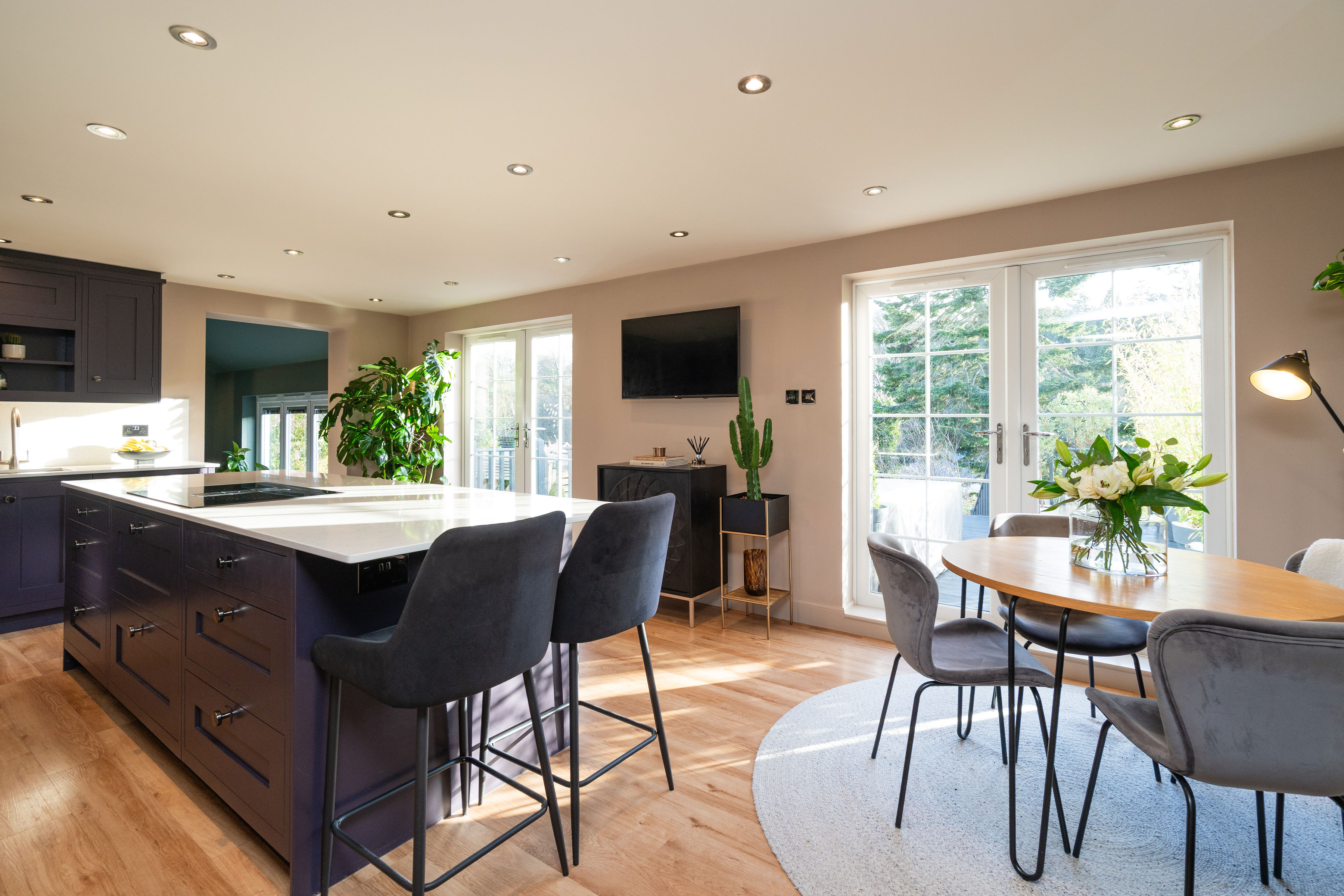 The accommodation has been comprehensively upgraded throughout, creating a home of real quality and comfort. At its heart is a stunning open-plan kitchen dining room, designed for modern living and entertaining. The bespoke kitchen by Sculleries of Stockbridge is fitted with extensive cabinetry, Siemens oven, grill and warming drawer, induction hob, integrated appliances and a large central island. French doors open directly onto a sunny deck, creating an effortless connection between inside and out.