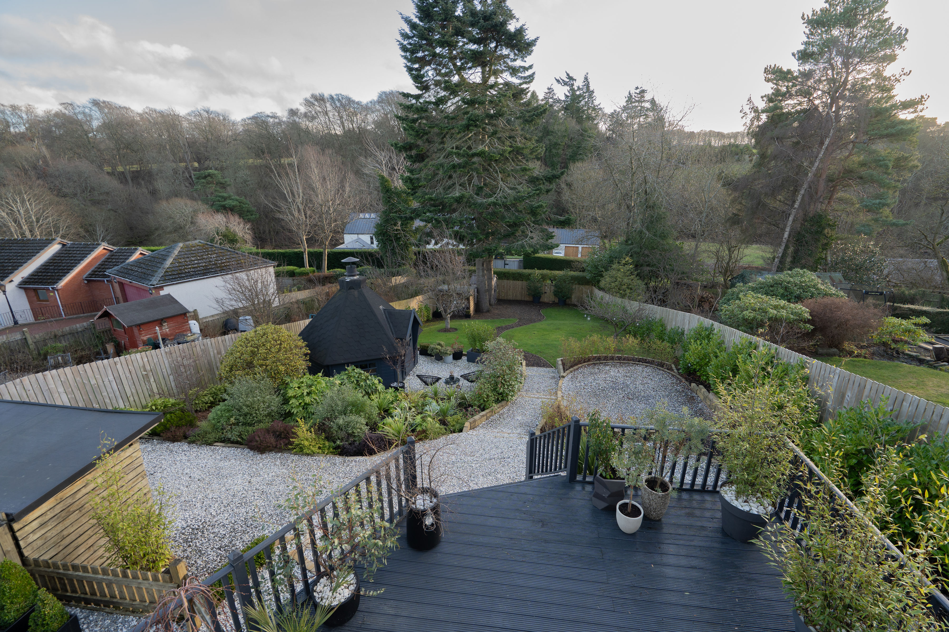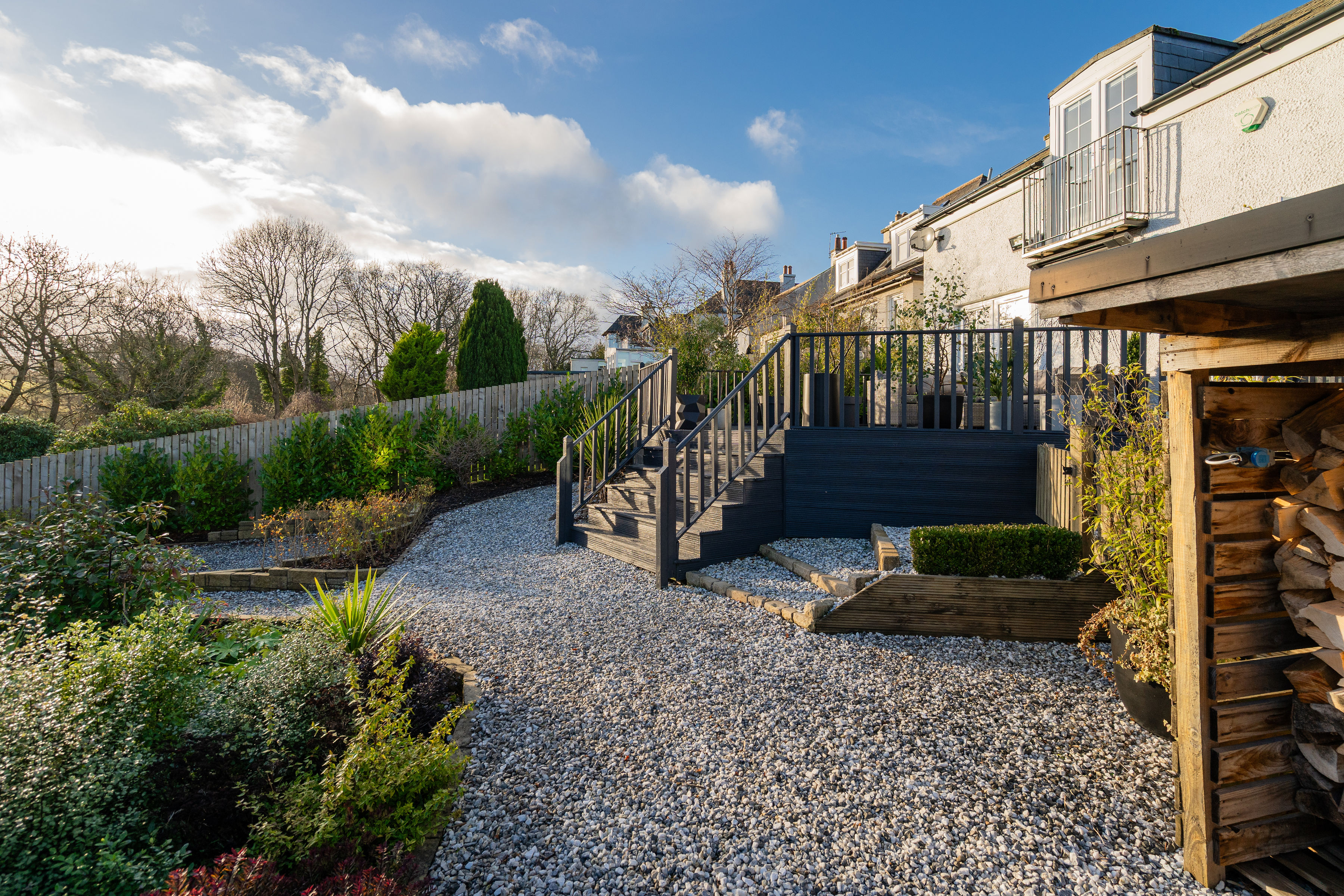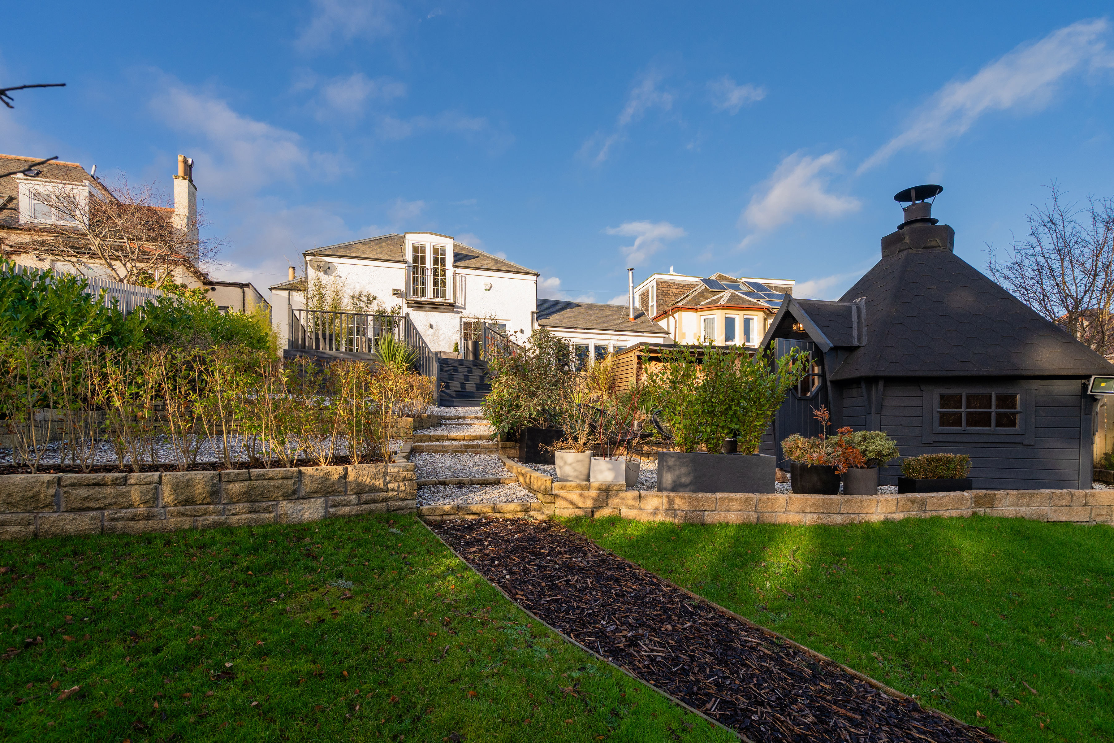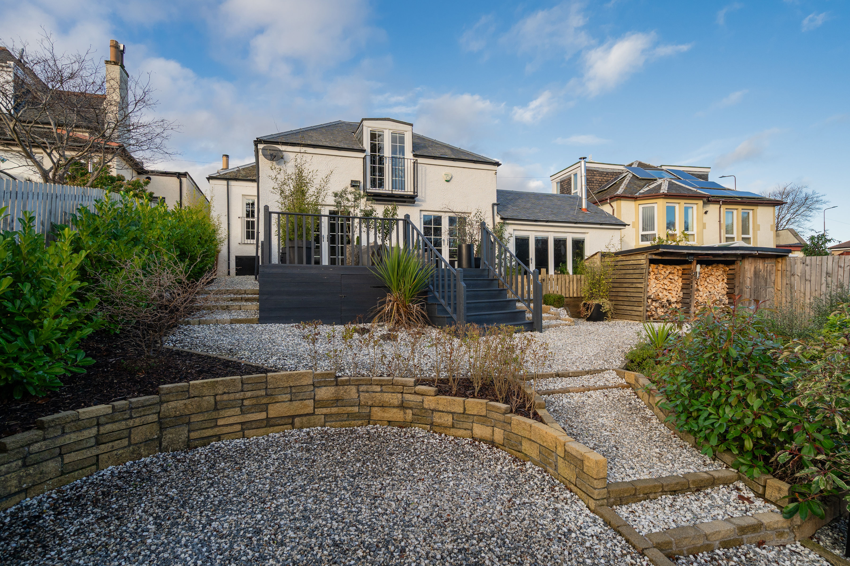 The gardens are a true highlight of the property. The south-facing rear garden is immaculately maintained and thoughtfully designed, featuring a sunny deck with open views, BBQ hut, garden shed and multiple wood stores. It offers the perfect space for both entertaining and relaxation and provides direct access to the Water of Leith walkway via a private gate. The landscaped front garden provides an attractive approach, while gates open to a secure driveway with EV charging point and security cameras, offering parking for multiple vehicles.