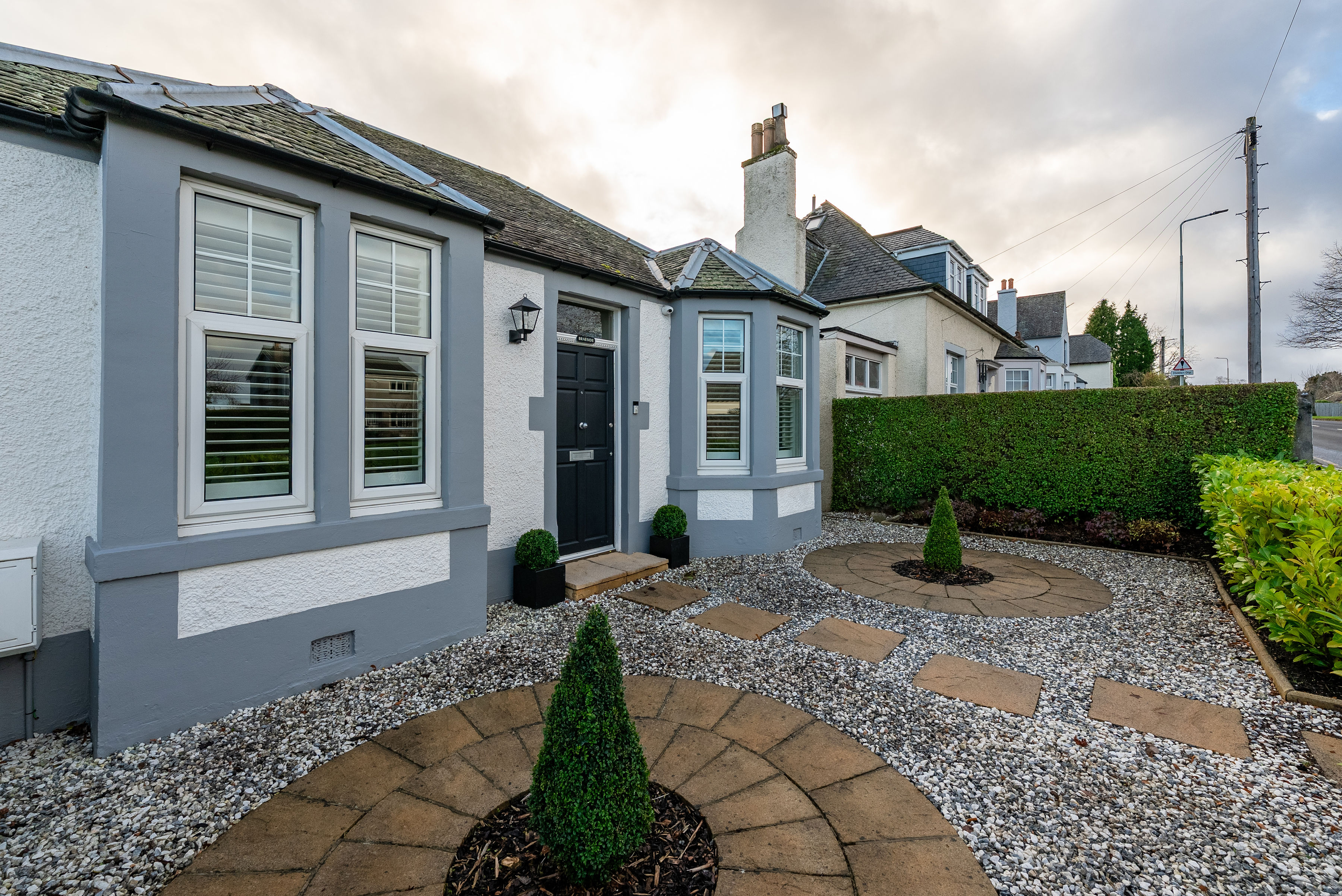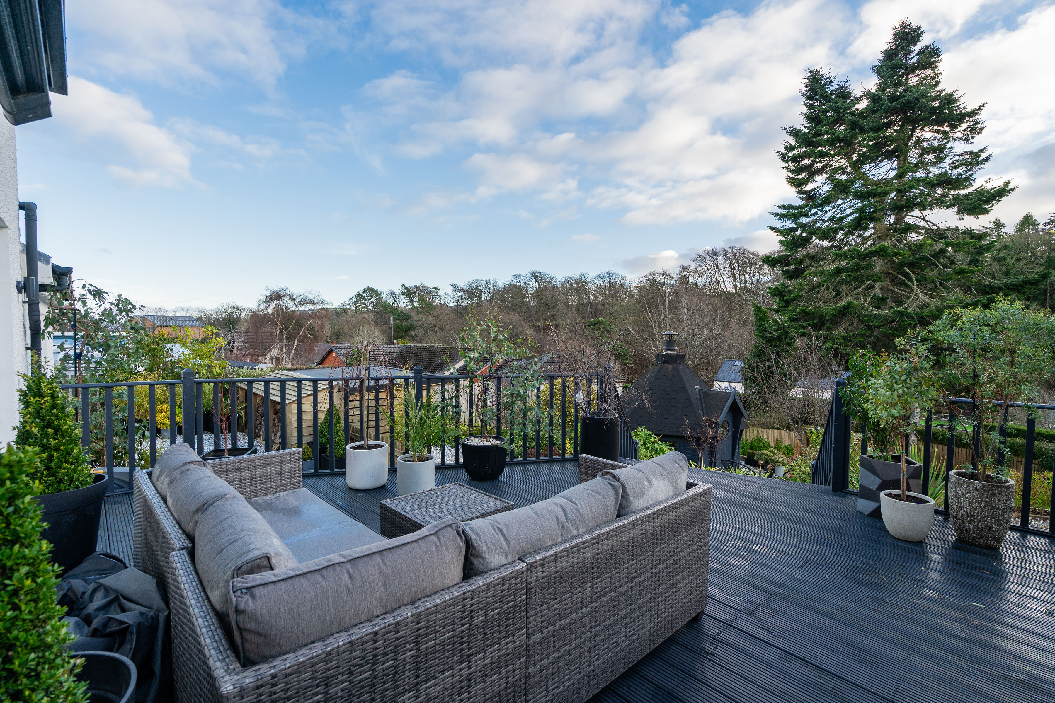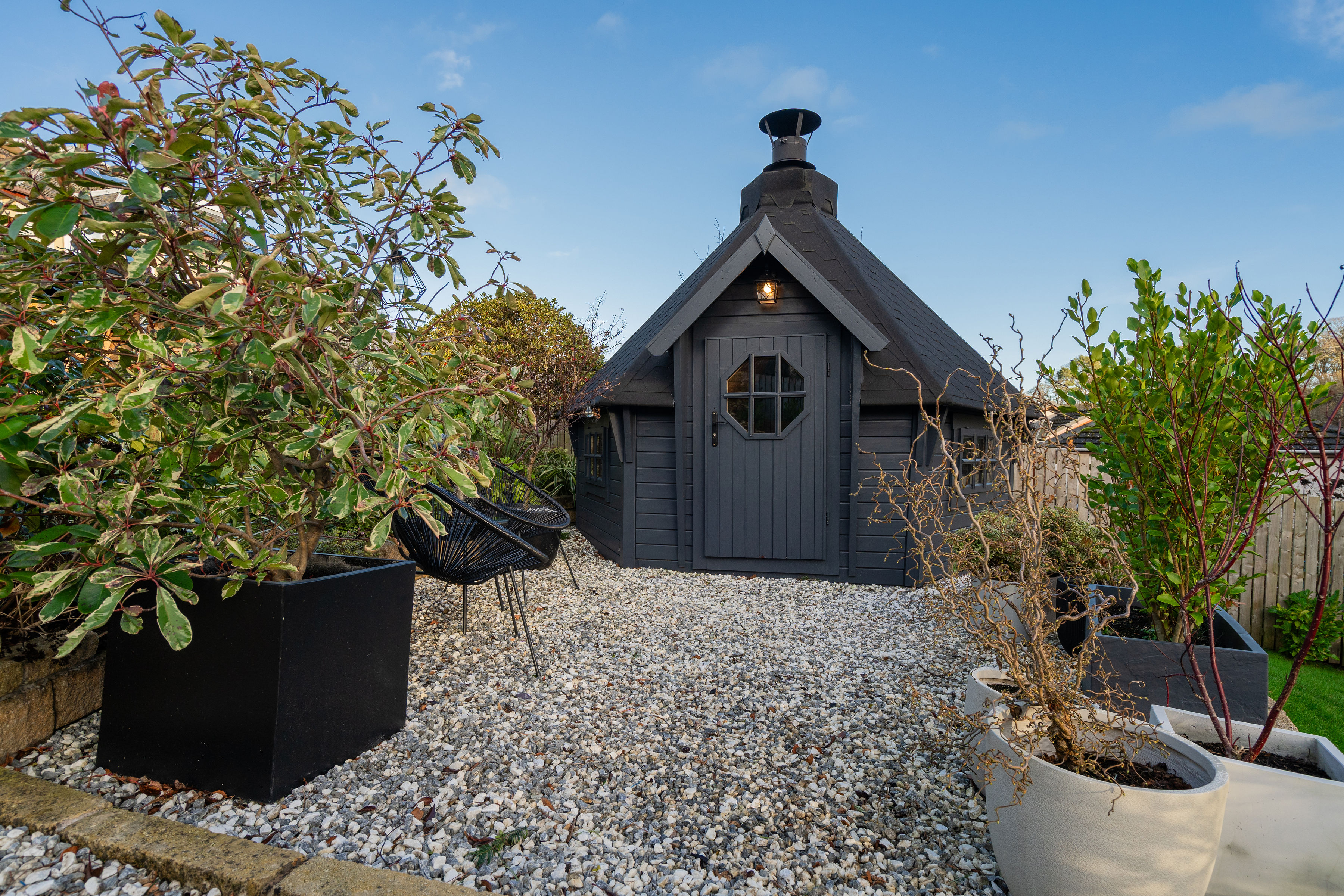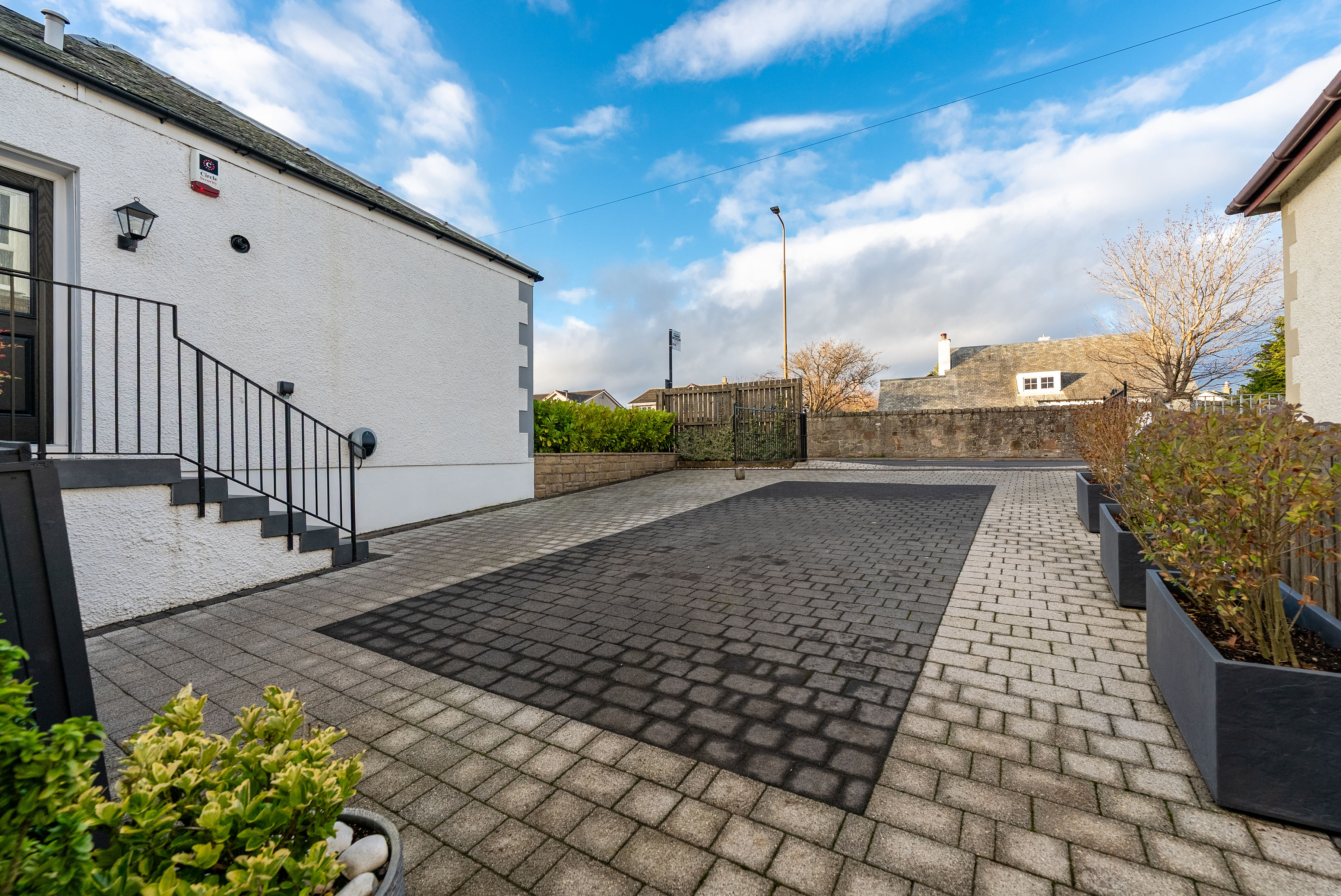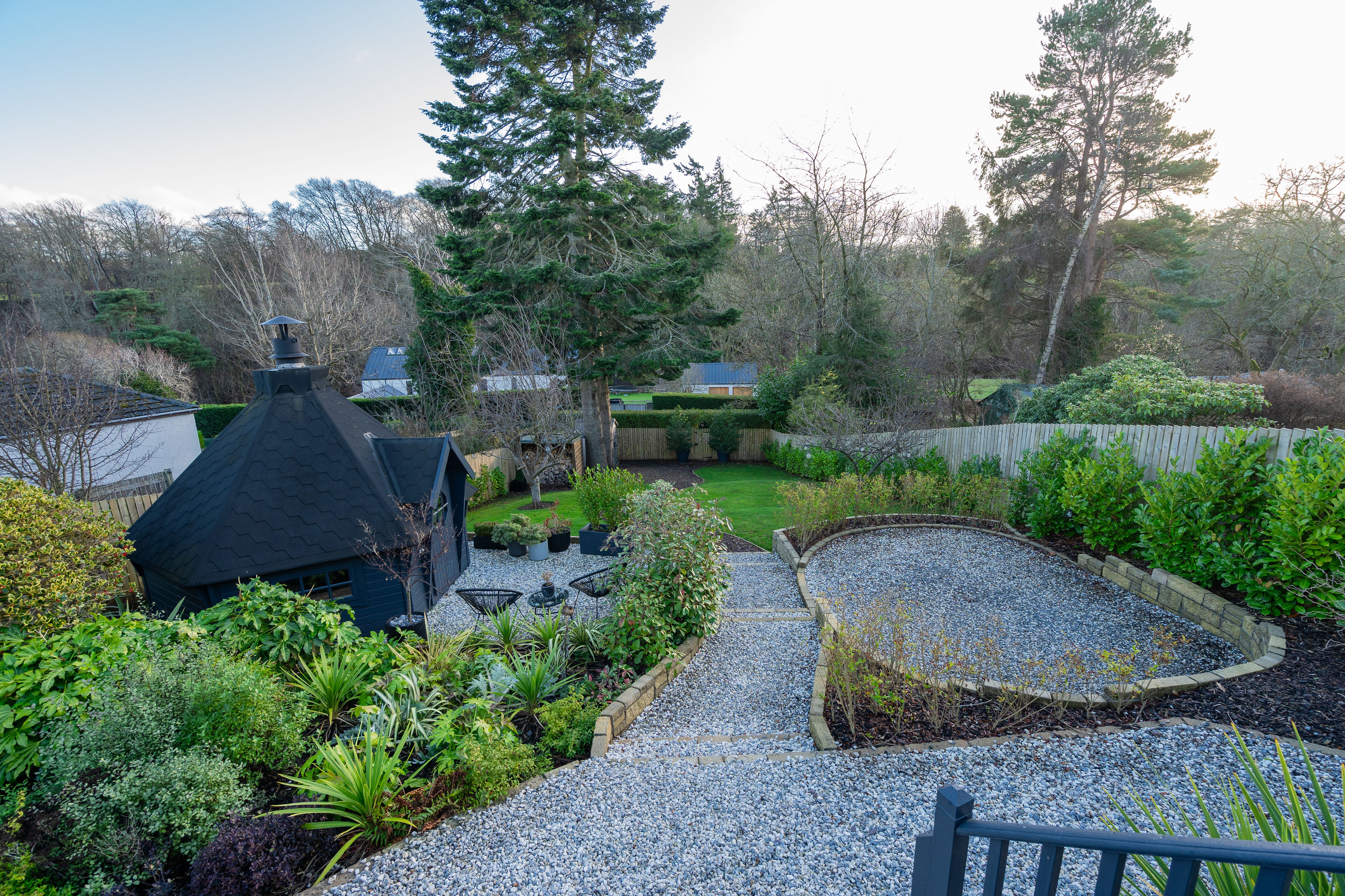 The gardens are a true highlight of the property. The south-facing rear garden is immaculately maintained and thoughtfully designed, featuring a sunny deck with open views, BBQ hut, garden shed and multiple wood stores. It offers the perfect space for both entertaining and relaxation and provides direct access to the Water of Leith walkway via a private gate. The landscaped front garden provides an attractive approach, while gates open to a secure driveway with EV charging point and security cameras, offering parking for multiple vehicles.