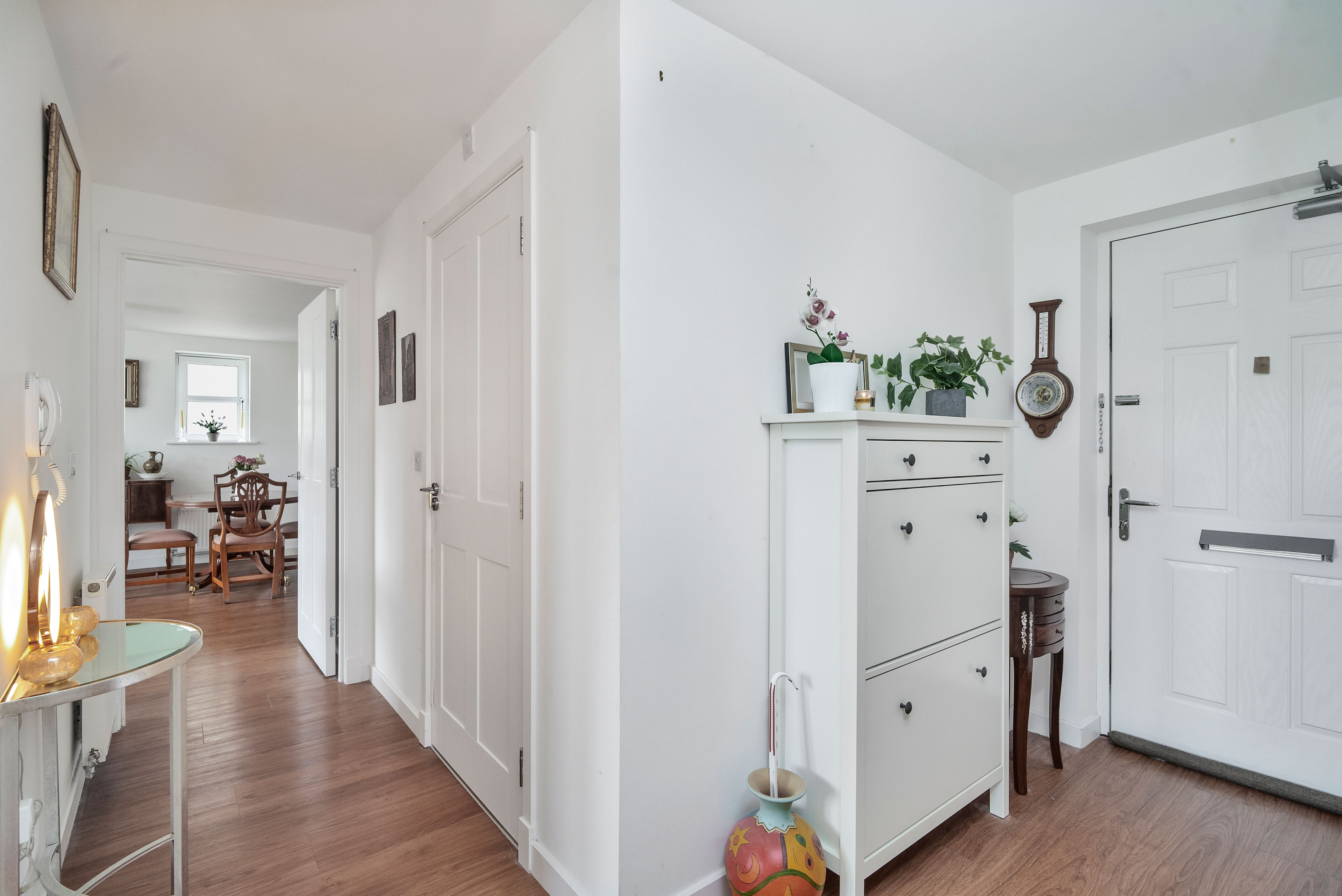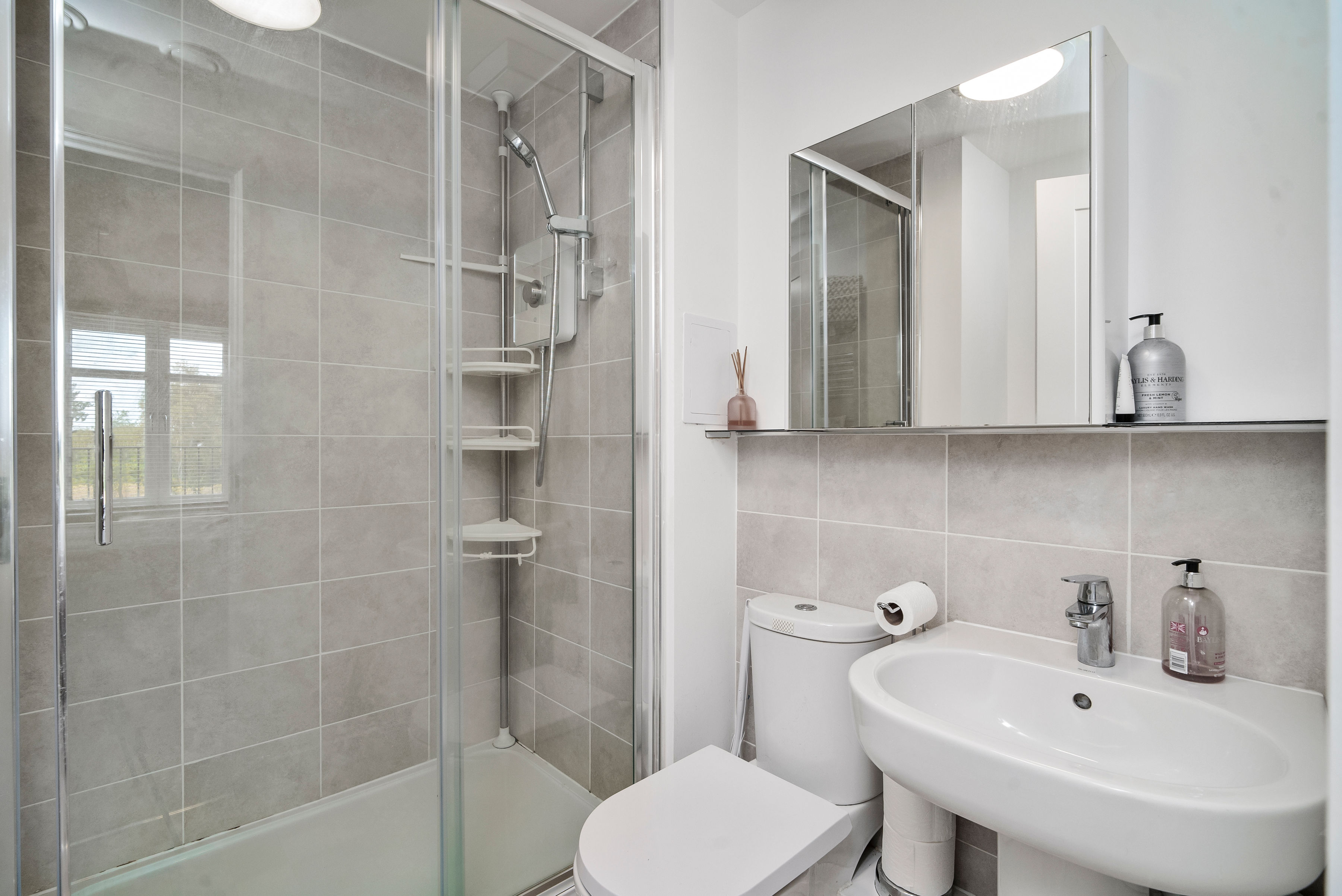 The principal bedroom features a sleek en-suite shower room, while a second well-proportioned bedroom offers flexibility for guests, home working, or family life. A modern three-piece bathroom with overhead shower and heated towel rail completes the accommodation.