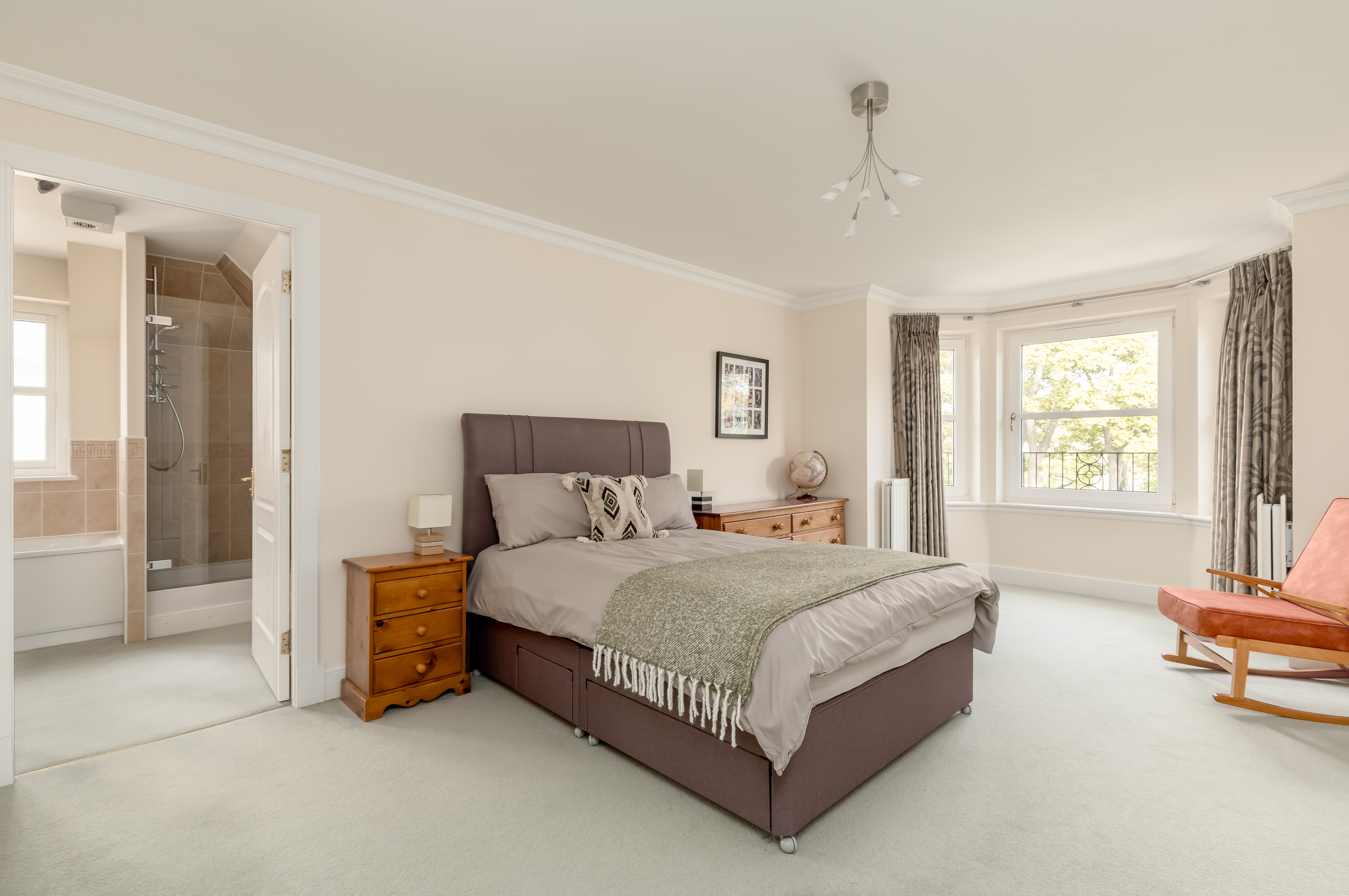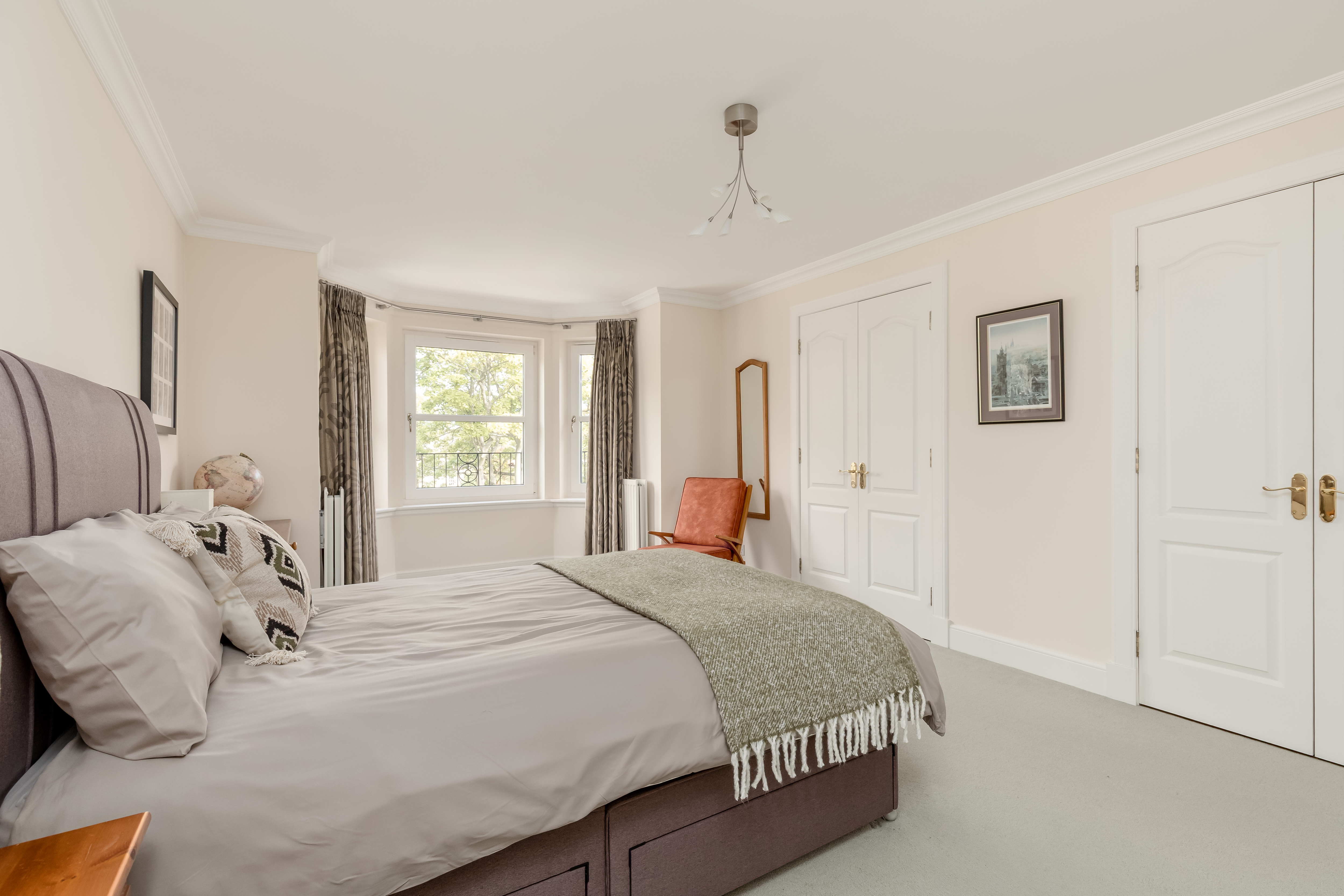 Offering added privacy, the 3 main bedrooms are situated to the rear of the flat and are all sizeable doubles with built-in wardrobes. The impressive principal bedroom has a bay window and a particularly large en suite featuring both a bath and separate shower cubicle. The fourth bedroom/dining room, family bathroom and multiple storage cupboards are all accessed from the central hall.